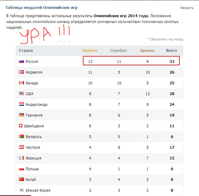 Starskrim22 Опубликовано: 23 февраля, 2014 Игроки 72 публикации 14 138 боёв Поделиться Опубликовано: 23 февраля, 2014 (изменено) Самый лучший подарок был на 23 - это наша ПОБЕДА в Олимпийских играх ! Идет закрытие, не пропустите. Изменено 23 февраля, 2014 пользователем Starskrim22 Изменения – закон жизни. И те, кто смотрит только в прошлое или только на настоящее, бесспорно – пропустят будущее. Ссылка на комментарий