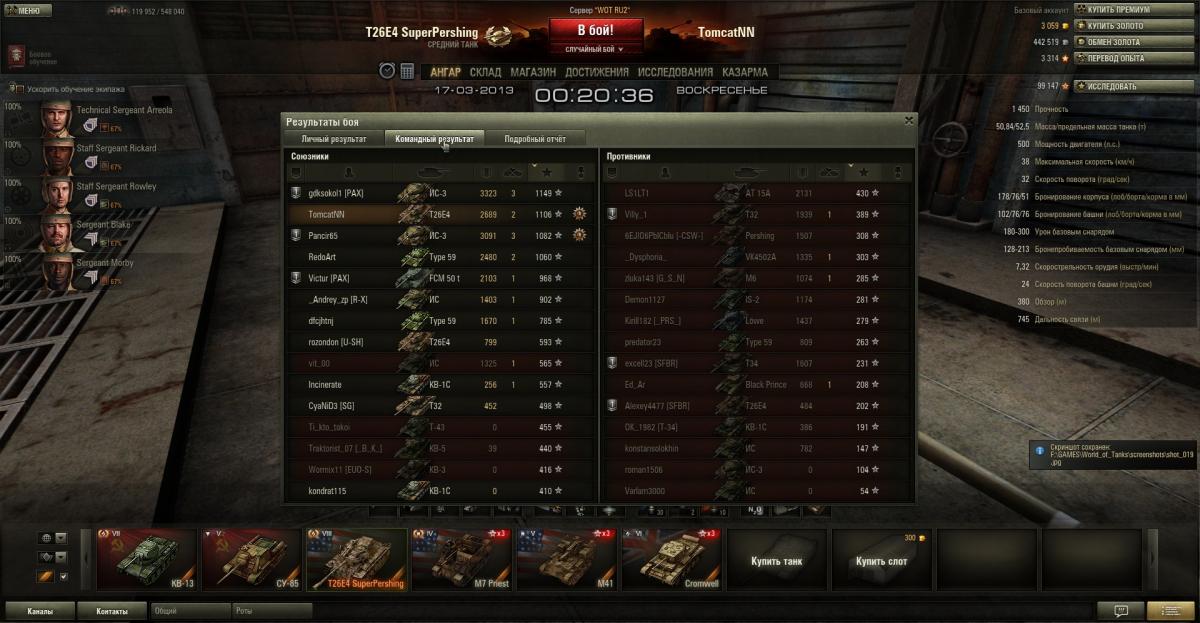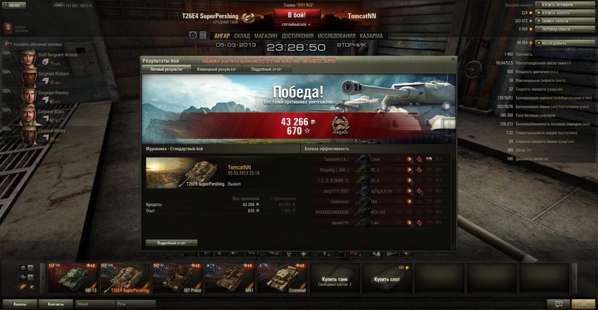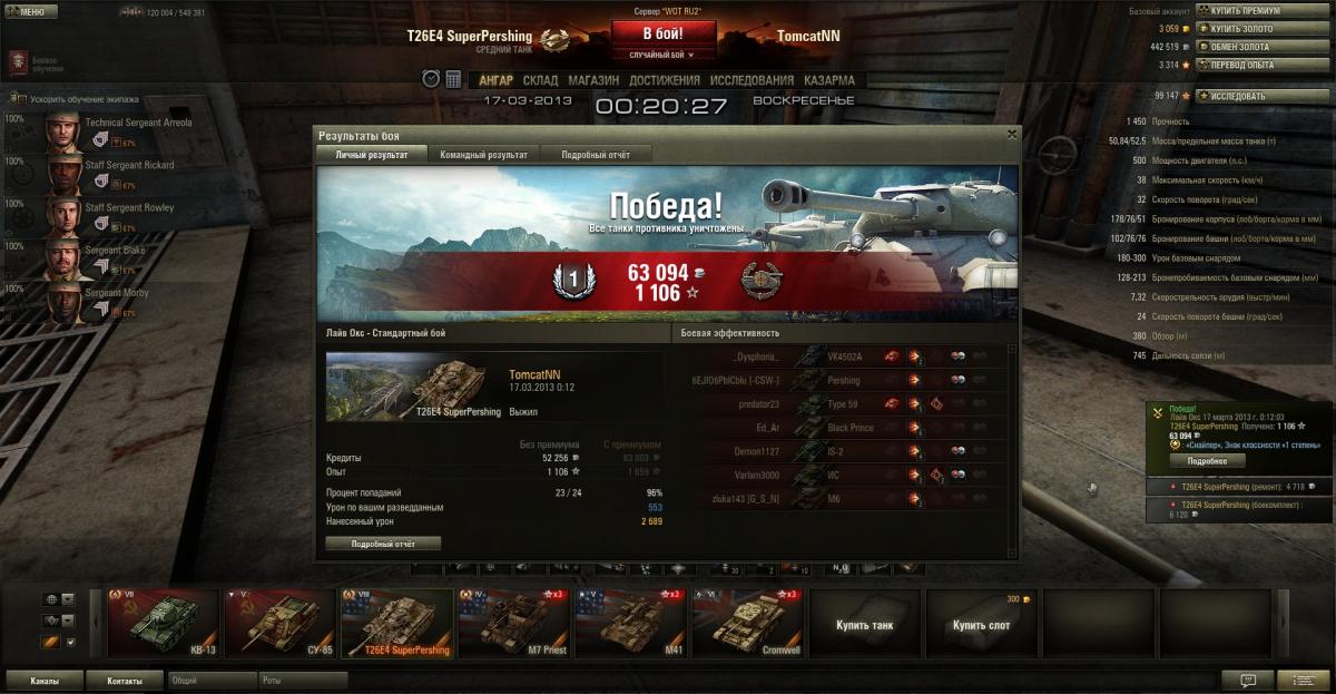 anonym_uGZshL3A9JfM Опубликовано: 14 мая, 2013 Игроки 146 публикаций 35 096 боёв Автор Поделиться Опубликовано: 14 мая, 2013 08 Май 2013 - 12:01 пользователь TomcatNN сказал:Танк тащит и тащит отлично. Прямите руки товарищи крабы.С ПА не особо напрягаясь 40-60к за бой легко. 60-100к с напрягом.За вечер (10 боев) набрать 500-650к серебра легко!! Сам Нуб, но пару советов дам.1. Занимайте позицию с укрытием или амбразурой. (если есть возможность) (почитайте тему Гайд по Т29, особенности тактического применения... очень поможет)2. Если такой возможности нет- мы вторая линия обороны.3. Если уж совсем враг близко - Клинч!! (да да очень эффективен)4. Выезд ромбом или обратным ромбом. Если противник одного уровня или ниже можно и выезд лбом.5. Если вас выцеливают, в прямой видимости, - танкуем (танцуем) корпус ромбиком - крутим в стороны немного, башней мотаем в противоположные стороны,пушкой водим вверх вниз (защищаем люки и под башней). Т.е. тем самым недаем противнику прицелится в наши уязвимые места. Щанс рикошета и не пробития повышается. С собой вожу пару подкалиберных - но пользуюсь ими редко, только в критические моменты. Не боюсь в клинче ИС3 и ИС6 - разбираются хорошо, но могут потрепать нормально. Леву лучше держать на дистанции - бъем в каток передний и стык НЛД и ВЛД. Т34 так же на дистанции в тушку. Самое интересное СУП против СУПа - выискивание в дуэли слабых мест !!. (должны знать досконально от а до я все слабые места СУПа!) Пара запоминающихся моментов из боев.1. Сдерживал до прихода подмоги из за камня 3х T26E4 и 1 ИС3. Ставил их на гусли и раздавал в борта. Они сами себе мешали кучей. Потом подоспел Т34. В двоем уже было полегче держать оборону.2. С 12% ХП оставшимися, стоял ромбом так же за камнем против ИС4, ИС7 и ИС8 с 300 метров нипробил ни один. Сплошные рикошеты. Правда в лоб я их задамажить так же не смог. (рикошеты)В итоге они подъехали на 100м и кто то попал мне в люк - т.е. добили в упор. Из допов, поставил на СУП, досылатель, рога-оптика, вертикальная наводка (для ускорения сведения). Взводом из 2-3 Супов можно много чего натворить или СУП + Тип59 или КВ5.Вчера отлично покатался взводом СУП+ Лева. 12 боев, 70% побед и 650к серебра в казну. !!Это как без напряга? Два раза нажал на R и на автоприцеле стреляю все время? 40 000 серебра без ПА это хороший результат, а 60 000 очень хороший. Я за 1к боев на Т26Е4 без ПА 100 000 ниразу не набил хотя напрягался на нем на конкретно. Пункты:1. Через башню танковать? Что бы все выцеливали нам балансиры? ИМХО как говорил Вспых лучше подставлять тушку, авось крабы будут в нлд лупить!2. Экий ты суровый дядька на подсосе 2 линии 40-60к не напрягаясь.3. Что значит близко клинч? Хз, может кому то и помогает я неклинчую, вблизи попасть в балансиры нам еще проще. Плюсов клинча точно нету.4. Ахахах шутник, обратный ромб))) У нас борта никакие! Да доворачивать можно но совсем немного и вилять корпусом когда тебя выцеливают. ИС-3 и ИС-6 легко? Да они одни из самых неприятных для Т26Е4, особенно ИС-3 в клинче с его башней. Кинь реплей хоть один заценить твое кунгфу. Ну последняя конфетка, топовое орудие ИС-8 (ИС-4) и ИС-7 пробивает Т26Е4 в ВЛД обычными ББ, целиться нужно в часть влд что над пулеметом. Опровергай) 3 Ссылка на комментарий
