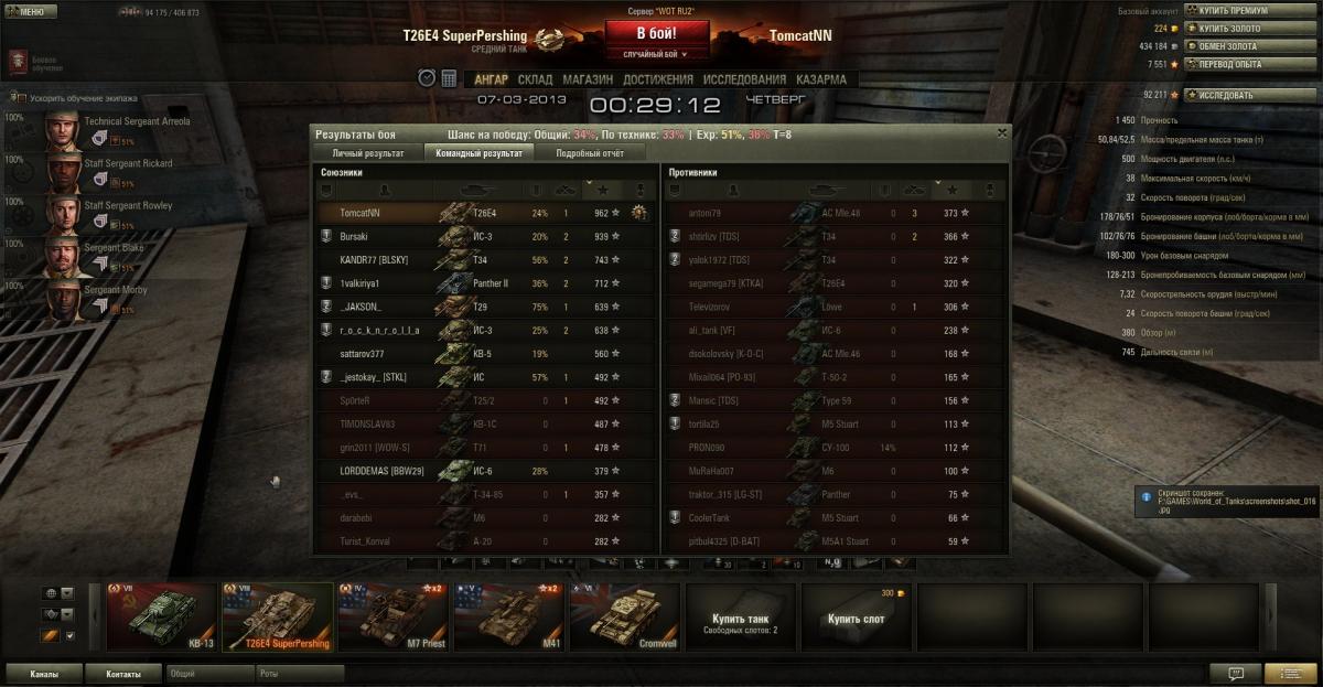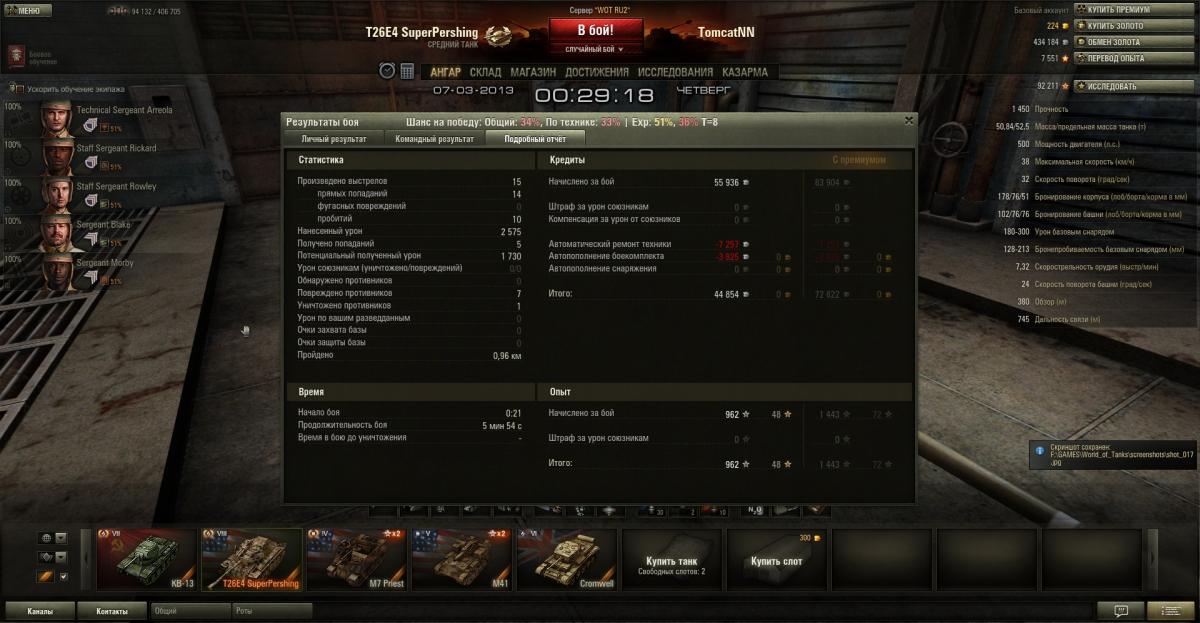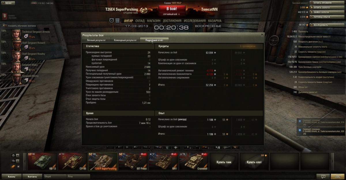 anonym_uGZshL3A9JfM Опубликовано: 17 мая, 2013 Игроки 146 публикаций 35 096 боёв Автор Поделиться Опубликовано: 17 мая, 2013 (изменено) 14 Май 2013 - 22:35 пользователь TomcatNN сказал:То Bigjktu. Вы похоже плохо тему про СУП читаете.http://forum.worldof...__st__34880#topИгрок IIIT90III со страницы 1745 показывает наглядно СУП против ИС3со 1750й СУП против Е75Рассматриваются в теме почти все 8е ТТ и СТ куда чего и как стрелять. Учите матчасть.Мне скрывать нечего. Конечно раз на раз не приходится. Но гнать на танк что он не тащит и плохой ИМХО неверно в корне.Вот некоторые средние скрины. С ПА бывало и получше. http://cdn-frm-eu.wargaming.net/wot/ru/uploads/monthly_05_2013/post-6960134-0-59004700-1368560036_thumb.jpg http://cdn-frm-eu.wargaming.net/wot/ru/uploads/monthly_05_2013/post-6960134-0-43190400-1368560043_thumb.jpg http://cdn-frm-eu.wargaming.net/wot/ru/uploads/monthly_05_2013/post-6960134-0-35791800-1368560050_thumb.jpg http://cdn-frm-eu.wargaming.net/wot/ru/uploads/monthly_05_2013/post-6960134-0-73329400-1368560056_thumb.jpg http://cdn-frm-eu.wargaming.net/wot/ru/uploads/monthly_05_2013/post-6960134-0-73323800-1368560063_thumb.jpg http://cdn-frm-eu.wargaming.net/wot/ru/uploads/monthly_05_2013/post-6960134-0-35323900-1368560070_thumb.jpg http://cdn-frm-eu.wargaming.net/wot/ru/uploads/monthly_05_2013/post-6960134-0-63146800-1368560076_thumb.jpghttp://wot-noobs.ru/button/tomcatnn.png Тему почистили нету там 1к страниц или сообщений, ничего не увидел, нового.А у меня в теме что не показано "куда чего и как стрелять"?Интересно что он там показывает?)) Куда пробивать ИС-3)) Типа ком башенка, нлд, и влд под более прямым углом?) Ну так все это берется 1 раз с 3 если везет!А вот Т26Е4 против Е-75 это бред) без голды мы даже нлд не возьмем, ну а ком башенка?.. ну 2-3 раза может попадем, а Е-75 4 шота и мы в ангар, ток после 2 мы критов нахватаемся и гореть будем! Я вижу ты начитался на форуме умных словечек и с своими 667 среднего урона за бой пишешь мне "учите матчасть". Ну так выучи ее ты. Ну все красава выложил три скрина, два с них по 60к. И что доказал? Я что говорил это нереально, я говорил это очень хороший результат! И где я сказал что он не тащит? Я указал на твои ошибки + что бы других не вводить в заблуждение. В оф гайде по Т26е4 много перцев выкладывают скрины с 100 000 - 200 000 профита. Перец настрелял 4к и больше дамага и срубил капусты, так че ж не показать подробные результаты боя? Да грязными он заработал примерно 100к а на голду ушли 80к или более. А то что голда, дак видно даже по первой странице отчета где 5 пробитий по Т-28, 6 по Е-75 и т.д. Да, некоторые мож он в бочину лупил или в опу зашел, но у нас 28 км/ч скорость и зайти в 80% случаев мы можем только в лоб!Я ничего против голды не имею. Но Т26Е4 танк для фарма, потому считаю что честнее мерятся чистой прибылью! Изменено 18 мая, 2013 пользователем Гость 1 Ссылка на комментарий