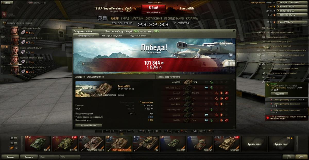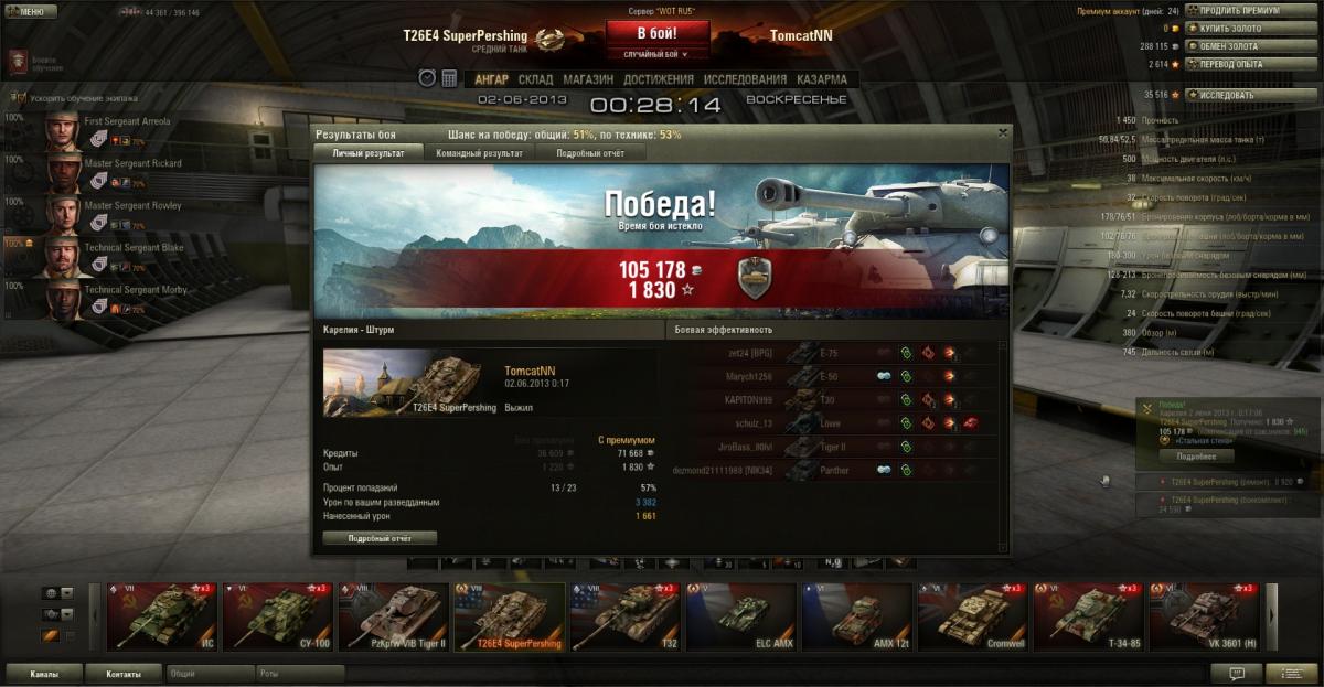 TomcatNN Опубликовано: 8 мая, 2013 Игроки 376 публикаций 22 795 боёв Поделиться Опубликовано: 8 мая, 2013 (изменено) Танк тащит и тащит отлично. Прямите руки товарищи крабы.С ПА не особо напрягаясь 40-60к за бой легко. 60-100к с напрягом.За вечер (10 боев) набрать 500-650к серебра легко!! Сам Нуб, но пару советов дам.1. Занимайте позицию с укрытием или амбразурой. (если есть возможность) (почитайте тему Гайд по Т29, особенности тактического применения... очень поможет)2. Если такой возможности нет- мы вторая линия обороны.3. Если уж совсем враг близко - Клинч!! (да да очень эффективен)4. Выезд ромбом или обратным ромбом. Если противник одного уровня или ниже можно и выезд лбом.5. Если вас выцеливают, в прямой видимости, - танкуем (танцуем) корпус ромбиком - крутим в стороны немного, башней мотаем в противоположные стороны,пушкой водим вверх вниз (защищаем люки и под башней). Т.е. тем самым недаем противнику прицелится в наши уязвимые места. Щанс рикошета и не пробития повышается. С собой вожу пару подкалиберных - но пользуюсь ими редко, только в критические моменты. Не боюсь в клинче ИС3 и ИС6 - разбираются хорошо, но могут потрепать нормально. Леву лучше держать на дистанции - бъем в каток передний и стык НЛД и ВЛД. Т34 так же на дистанции в тушку. Самое интересное СУП против СУПа - выискивание в дуэли слабых мест !!. (должны знать досконально от а до я все слабые места СУПа!) Пара запоминающихся моментов из боев.1. Сдерживал до прихода подмоги из за камня 3х T26E4 и 1 ИС3. Ставил их на гусли и раздавал в борта. Они сами себе мешали кучей. Потом подоспел Т34. В двоем уже было полегче держать оборону.2. С 12% ХП оставшимися, стоял ромбом так же за камнем против ИС4, ИС7 и ИС8 с 300 метров нипробил ни один. Сплошные рикошеты. Правда в лоб я их задамажить так же не смог. (рикошеты)В итоге они подъехали на 100м и кто то попал мне в люк - т.е. добили в упор. Из допов, поставил на СУП, досылатель, рога-оптика, вертикальная наводка (для ускорения сведения). Взводом из 2-3 Супов можно много чего натворить или СУП + Тип59 или КВ5.Вчера отлично покатался взводом СУП+ Лева. 12 боев, 70% побед и 650к серебра в казну. !! Изменено 8 мая, 2013 пользователем TomcatNN 1 Ну и что, что олень. Нижегородец я! Ссылка на комментарий
