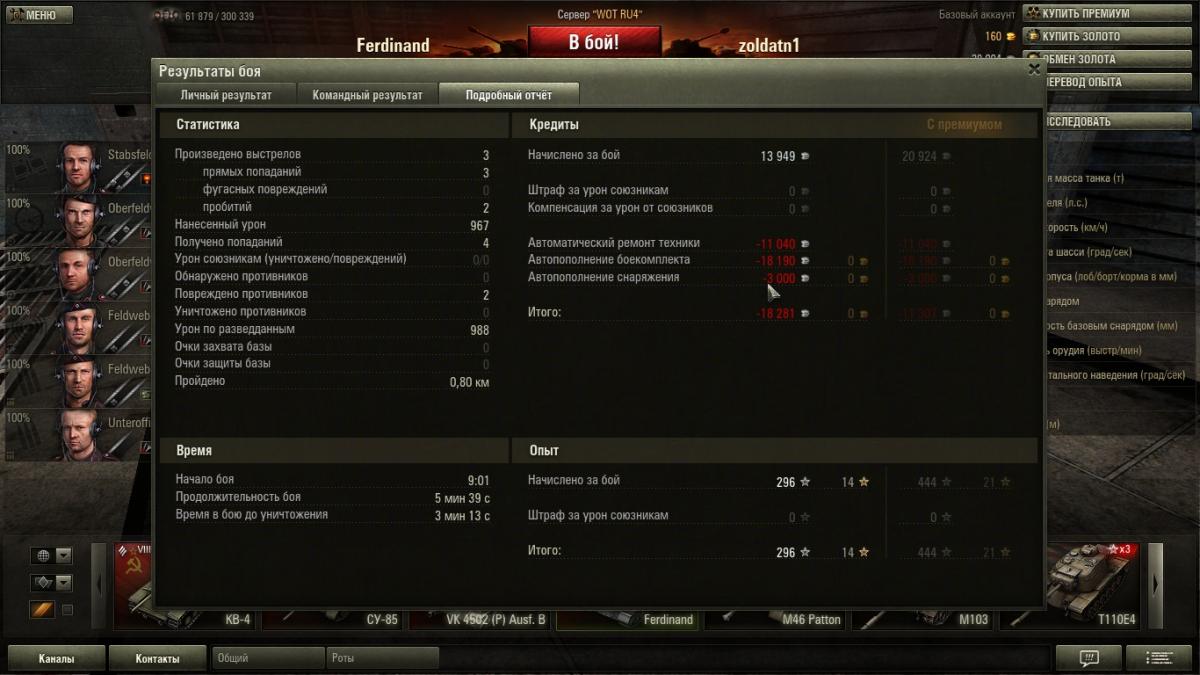 zoldatn1 Опубликовано: 11 ноября, 2012 Игроки 203 публикации 101 299 боёв Поделиться Опубликовано: 11 ноября, 2012 Доброго времениСейчас вышел в бой на феде, в бою сделал 3 выстрела по 1070 серебра за выстрел, после боя пополнение боекомплекта обошлось в 18 190 серебра, по умолчанию боекомплект на этом танке 20 выстрелов в бой вошел с 6 выстрелами.В чем причина снятия серебра за 17 не произведенных выстрелов? http://cdn-frm-eu.wargaming.net/wot/ru/uploads/monthly_11_2012/post-4563684-0-44306000-1352618766_thumb.jpg 1 Ссылка на комментарий