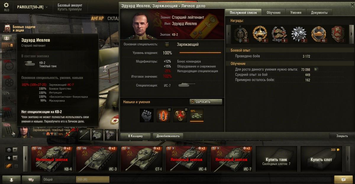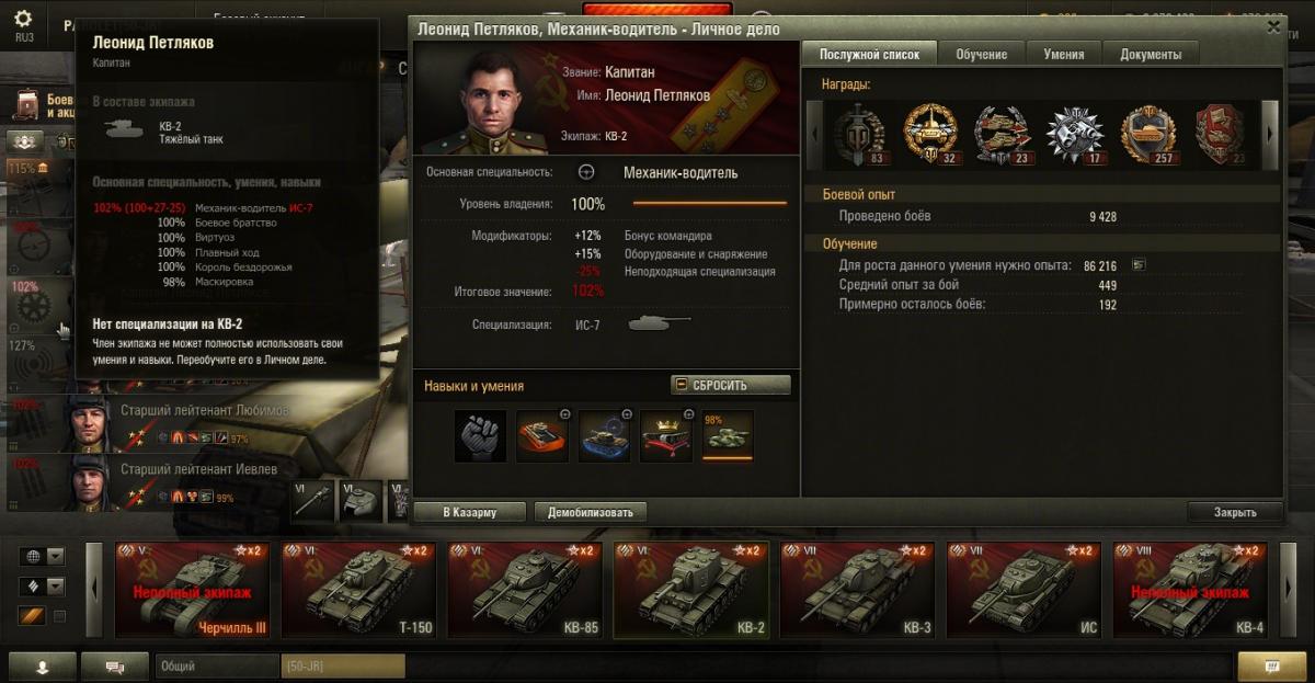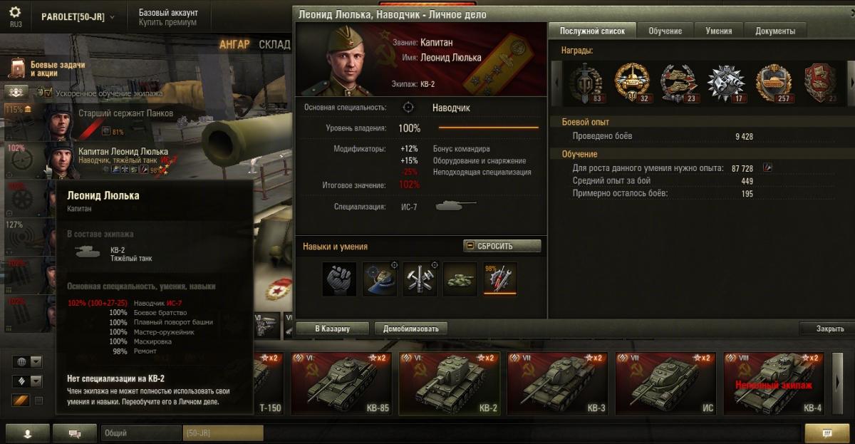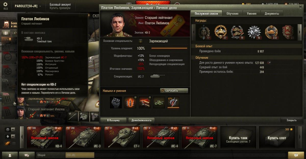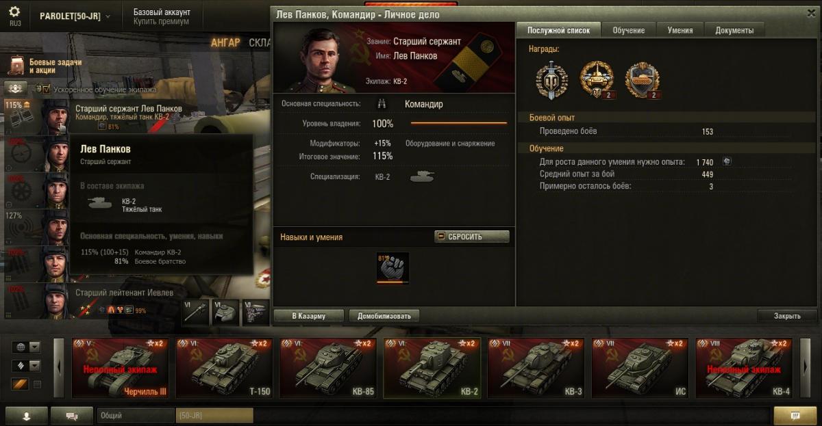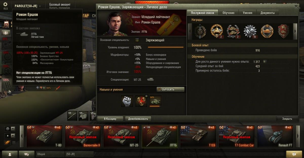 PAROLET Опубликовано: 25 октября, 2014 Игроки 8 400 публикаций 207 968 боёв Поделиться Опубликовано: 25 октября, 2014 (изменено) 25 Окт 2014 - 06:14 пользователь PAROLET сказал: Теперь, на примере Т34-85 я покажу что будет если иметь на танке всего лишь одного родного командира, а остальных пересадить с однотипного танка. В данном случае с А44. Думаю пояснять не надо - всё прекрасно видно: командир имеет 120%, остальные 107%. Теперь на примере КВ2 покажу ещё один вариант. Командир родной но ББ ещё не выкачано и соответственно этот навык не даёт компенсацию штрафа, расчёт его основной спецухи виден - 115 %. Также родным является радист(был ранее переучен с КВ1), его спецуха равна - 127 %, Для остальных парней, пересаженных и ИС7, основная спецуха равна -102 %.Таким образом из приведённых примеров наглядно видно как можно манипулировать экипажами, пересаживаю их с однотипных танков без переобучения или с частичными переобучениями. И при этом мы имеем в ангаре столько однотипных танков, сколько пожелаем, и на всех будем играть без проблем в своё удовольствие - что собственно я уже давно и делаю.У меня танков много, а казарму ни разу не расширял так как она пустая.http://cdn-frm-eu.wargaming.net/4.2/style_emoticons/wot/Smile_Default.gif Изменено 25 октября, 2014 пользователем PAROLET Aut cum scuto, aut in scuto! Ссылка на комментарий Поделиться на других сайтах Другие способы поделиться...