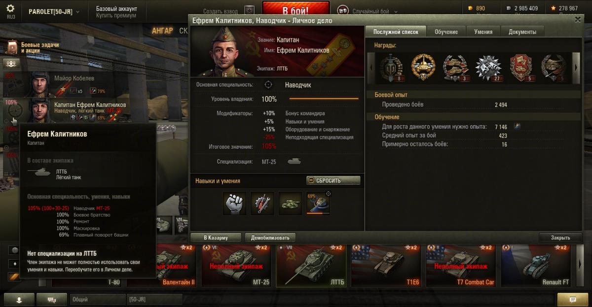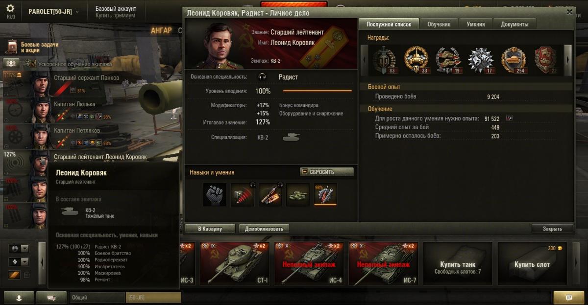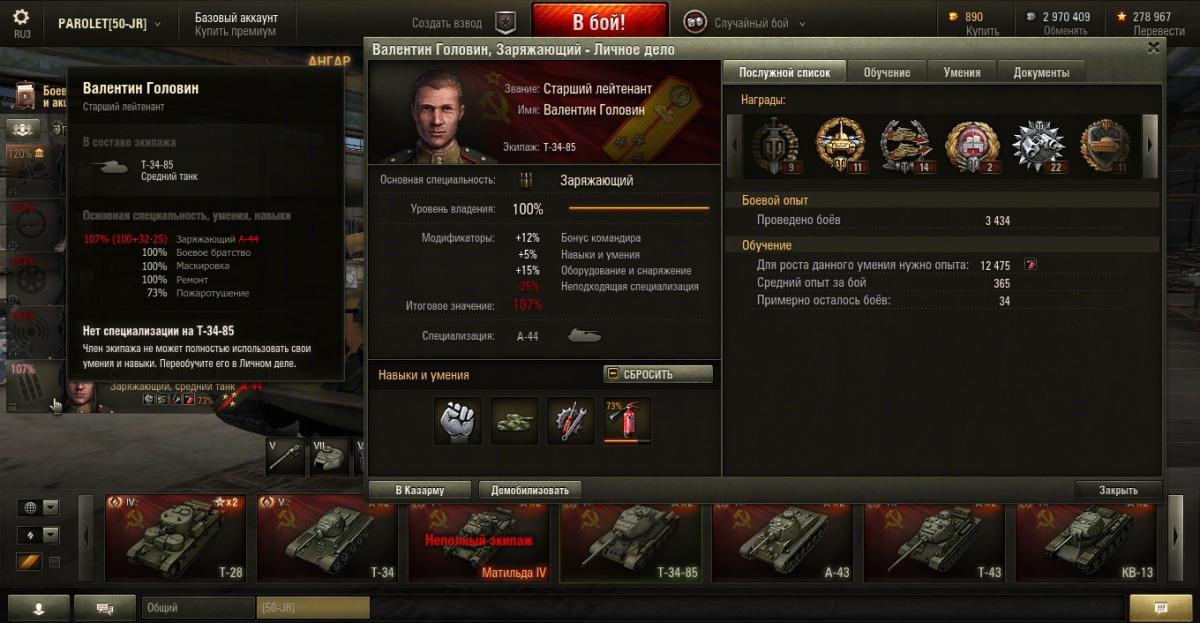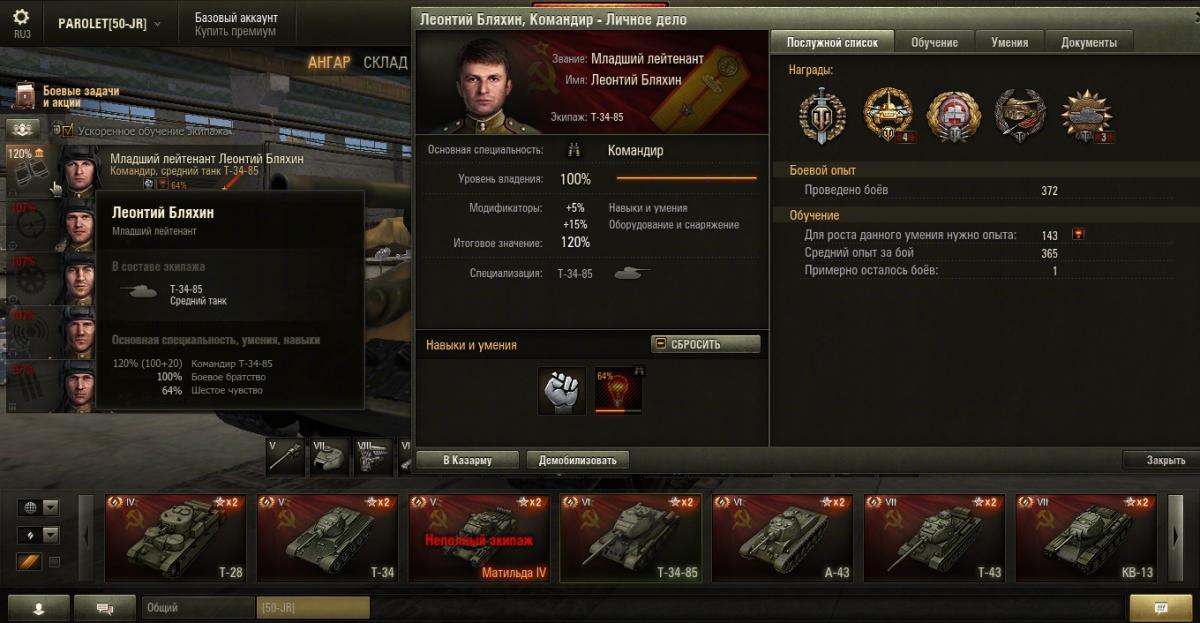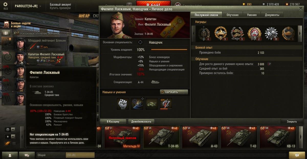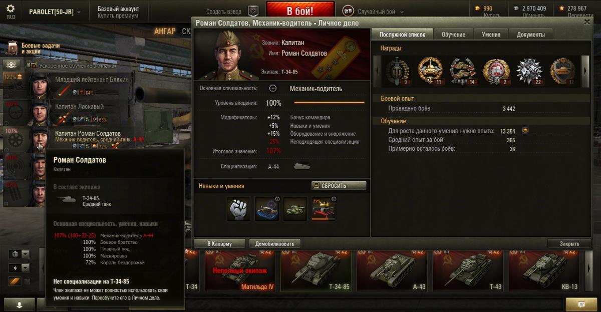PAROLET Опубликовано: 25 октября, 2014 Игроки 8 400 публикаций 207 968 боёв Поделиться Опубликовано: 25 октября, 2014 (изменено) 25 Окт 2014 - 06:14 пользователь PAROLET сказал: Теперь, на примере Т34-85 я покажу что будет если иметь на танке всего лишь одного родного командира, а остальных пересадить с однотипного танка. В данном случае с А44. Думаю пояснять не надо - всё прекрасно видно: командир имеет 120%, остальные 107%. Теперь на примере КВ2 покажу ещё один вариант. Командир родной но ББ ещё не выкачано и соответственно этот навык не даёт компенсацию штрафа, расчёт его основной спецухи виден - 115 %. Также родным является радист(был ранее переучен с КВ1), его спецуха равна - 127 %, Для остальных парней, пересаженных и ИС7, основная спецуха равна -102 %.Таким образом из приведённых примеров наглядно видно как можно манипулировать экипажами, пересаживаю их с однотипных танков без переобучения или с частичными переобучениями. И при этом мы имеем в ангаре столько однотипных танков, сколько пожелаем, и на всех будем играть без проблем в своё удовольствие - что собственно я уже давно и делаю.У меня танков много, а казарму ни разу не расширял так как она пустая.http://cdn-frm-eu.wargaming.net/4.2/style_emoticons/wot/Smile_Default.gif Изменено 25 октября, 2014 пользователем PAROLET Aut cum scuto, aut in scuto! Ссылка на комментарий Поделиться на других сайтах Другие способы поделиться...