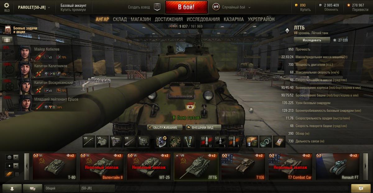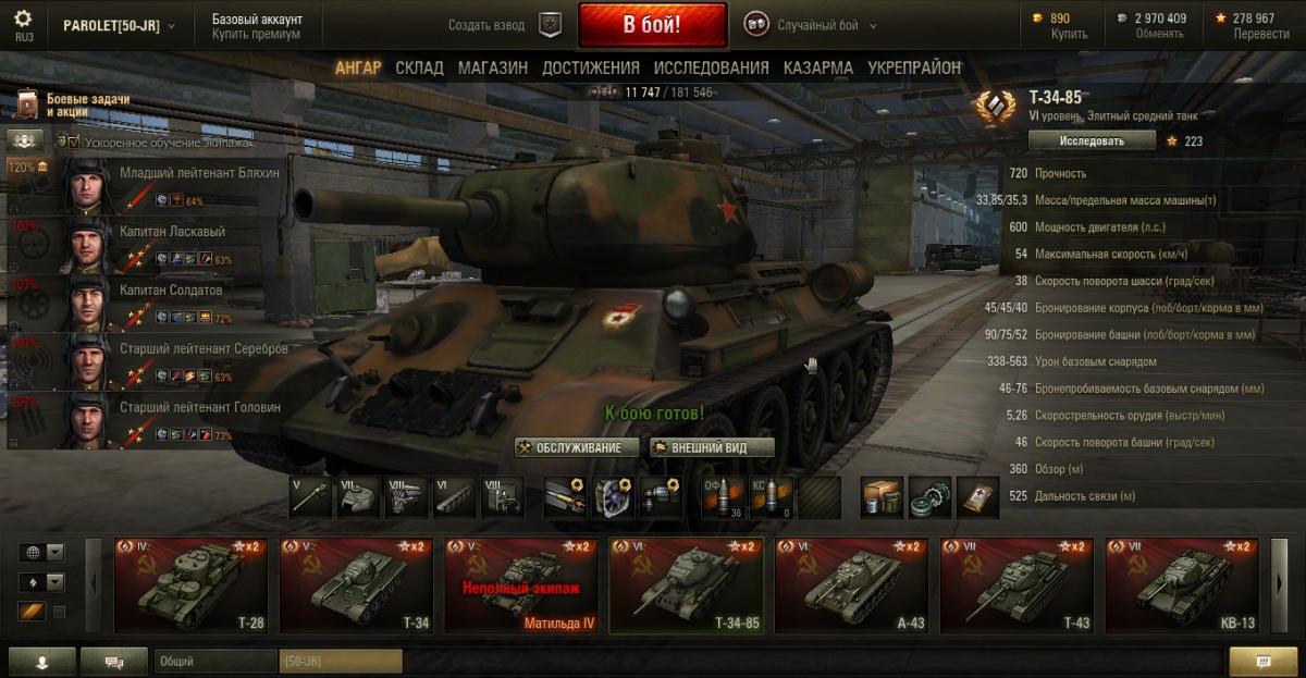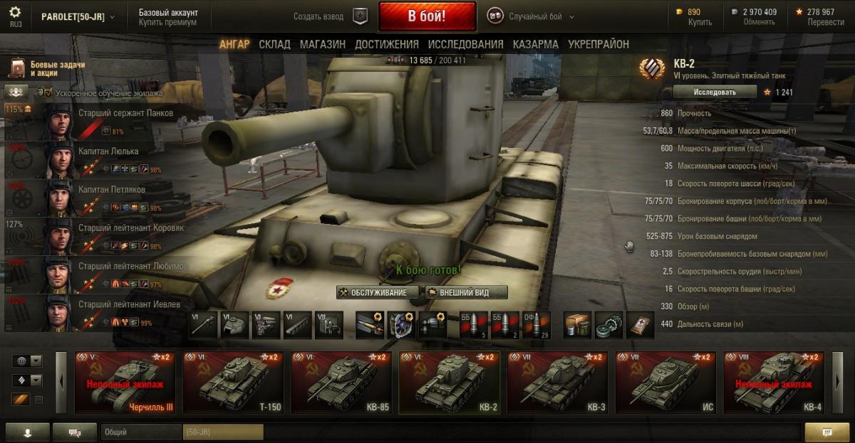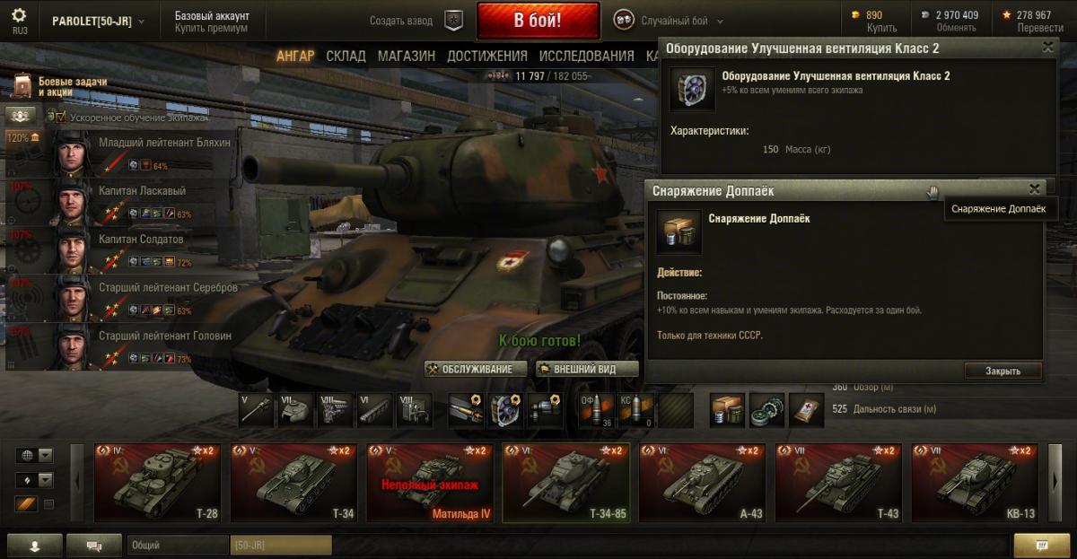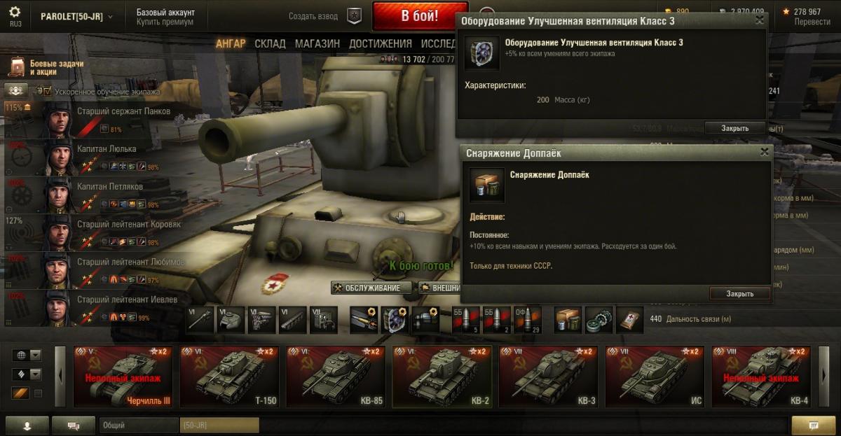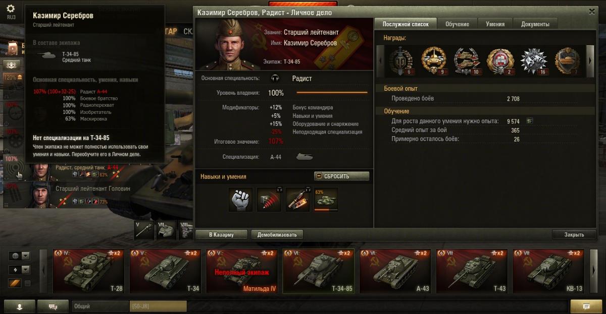 PAROLET Опубликовано: 25 октября, 2014 Игроки 8 400 публикаций 207 968 боёв Поделиться Опубликовано: 25 октября, 2014 (изменено) 25 Окт 2014 - 06:14 пользователь PAROLET сказал: Теперь, на примере Т34-85 я покажу что будет если иметь на танке всего лишь одного родного командира, а остальных пересадить с однотипного танка. В данном случае с А44. Думаю пояснять не надо - всё прекрасно видно: командир имеет 120%, остальные 107%. Теперь на примере КВ2 покажу ещё один вариант. Командир родной но ББ ещё не выкачано и соответственно этот навык не даёт компенсацию штрафа, расчёт его основной спецухи виден - 115 %. Также родным является радист(был ранее переучен с КВ1), его спецуха равна - 127 %, Для остальных парней, пересаженных и ИС7, основная спецуха равна -102 %.Таким образом из приведённых примеров наглядно видно как можно манипулировать экипажами, пересаживаю их с однотипных танков без переобучения или с частичными переобучениями. И при этом мы имеем в ангаре столько однотипных танков, сколько пожелаем, и на всех будем играть без проблем в своё удовольствие - что собственно я уже давно и делаю.У меня танков много, а казарму ни разу не расширял так как она пустая.http://cdn-frm-eu.wargaming.net/4.2/style_emoticons/wot/Smile_Default.gif Изменено 25 октября, 2014 пользователем PAROLET Aut cum scuto, aut in scuto! Ссылка на комментарий Поделиться на других сайтах Другие способы поделиться...