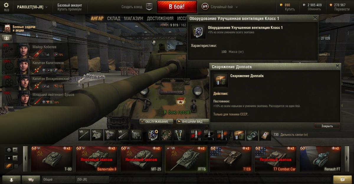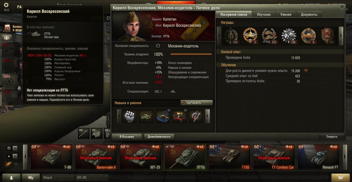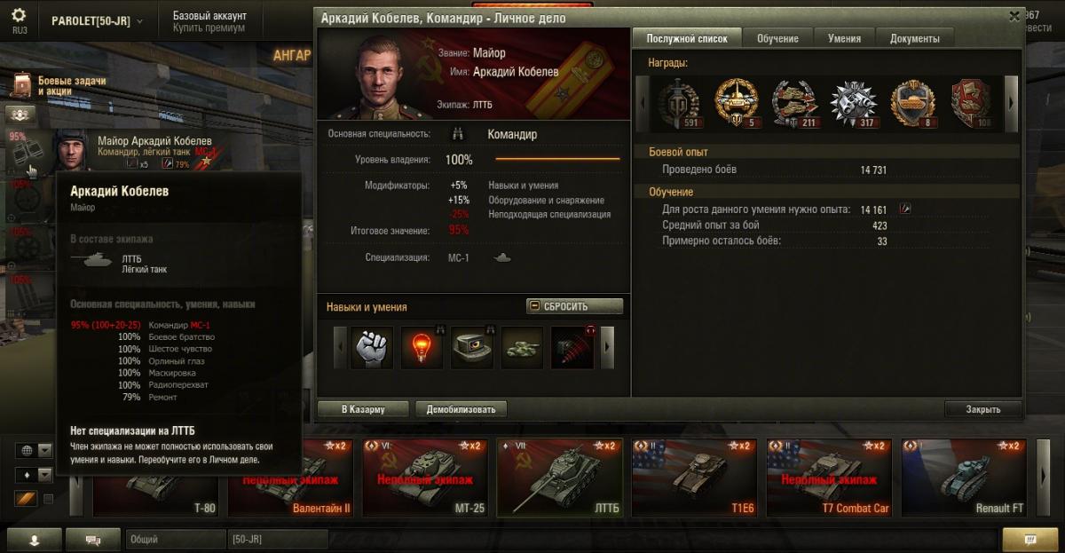 PAROLET Опубликовано: 25 октября, 2014 Игроки 8 400 публикаций 207 968 боёв Поделиться Опубликовано: 25 октября, 2014 24 Окт 2014 - 15:53 пользователь PAROLET сказал:Вам дали не полный ответ, а частичный. Есть и оптимистичное продолжение.Если Вы пересаживаете экипаж с одного танка на другой (не прем.)без переобучения, то на него накладывается штраф по основной спецухе. При этом есть разные велечины штрафа.Если пересаживаем на один и тот же класс техники ( с ЛТ на ЛТ, с СТ на СТ, с ТТ на ТТ и т.д.) то размер штрафа составит 25%.Если пересаживаем на другой класс (с ЛТ на СТ, с ЛТ на ПТ, с АРТы на СТ и т.д.) то размер штрафа 50%.Однако есть возможность компенсировать величину штрафа. На это влияет перк ББ у всех членов экипажа (+5%), модуль "Улучшенная вентиляция" (+5%),.расходник "Доп.паёк"(и аналоги) (+10%), а так же командирский бонус другим членам экипажа(от 8% до 10%).Таким образом, если Вы пересадите экипаж со 100% основной спецухой с ЛТ на ЛТ(с ПТ на ПТ) без переобучения, то при выкачанном ББ и установленных "вентиляции" и "доп.пайке", экипаж будет иметь следующий расчёт основной спецухи со штрафом -25%.Командир: 100% - 25%(штраф)+5%(ББ)+5%(вентиляция)+10%(доп.паёк)=95%Наводчик и др. : 100%-25%(штраф)+5%(ББ)+5%(вентиляция)+10%(доп.паёк)+10%(командирский бонус)=105%Так что есть возможность играть с комфортом не переобучая экипаж при пересаживании на однотипный танк по классу.Есть ещё и другие возможности манипулировать экипажами. Если хотите, то позже я вам всё покажу в скринах. Пока у меня нет доступа к клиенту. Вот наглядный пример пересадки на ЛТТБ экипажа с двух других ЛТ - МС1 и МТ25. Тут всё хорошо видно как рассчитывается основная спецуха по описанному выше варианту. Aut cum scuto, aut in scuto! Ссылка на комментарий Поделиться на других сайтах Другие способы поделиться...