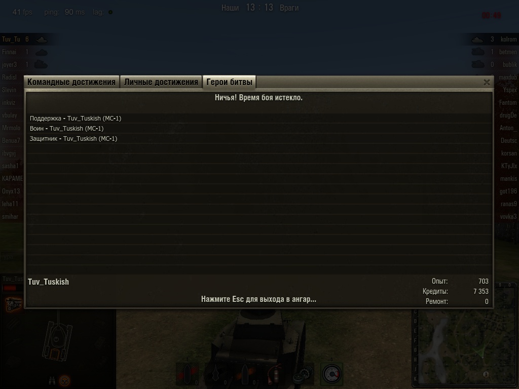 anonym_N4MSl8nLSOnY Опубликовано: 23 февраля, 2011 Игроки 1 306 публикаций 14 115 боёв Жалоба Поделиться Опубликовано: 23 февраля, 2011 Перенесу из другой темы 15 Фев 2011 - 13:29 пользователь Voad сказал:Тезисно:МС-1 и КВ-2 любимые танки - навеки в ангаре. Играть на МС-1 не считаю зазорным или стыдным, это ведь тоже танк. Опыт: средний показатель - 500 (макс - около 2500 удвоенного за бой) Деньги: средний показатель - 2000-4000 (макс - около 6500 за бой)Фраги: в среднем 1-4 (макс - 9 за бой)Экипаж: 100%+94% маскировка.Пушка: 45мм.Боекомплект: ББ+2 фугаса. Иногда не хватает до конца боя, хотя по машинкам, заборчикам и почей фигне не стреляю. Только туда, где есть или был противник.Процент попадания: около 50% за бой.Допы: маск-сеть, вентиляция, стереотруба.Медали: десятки их (поддержка, воин, захватчик, защитник, есть даже "Бойот")Тактика: а) Малиновка - "молчаливый" свет в кустиках как можно ближе к центру карты.б) Пагорки - ПТ-снайпер рядом с базой. (Горка сверху или выход на остров снизу)в) Химмельсдорф - смешанный стиль, в основном - танк прорыва и уничтожения. Ну, собственно, вот что можно на нем натворить в Малиновке. Апдейт:Сеть поменял на приводы. Так что теперь Приводы наводки, вентиляция, стереотруба. Думаю ещё заменить вентиляциию на просветлённую оптику...Соврал, "Бойота" пока нет. 16 воинов, 1 захватчик, 3 защитника, 13 поддержек, 1 разведчик. 35 Стрелок и 19 бронебойщик. 4 Ссылка на комментарий Поделиться на других сайтах Другие способы поделиться...