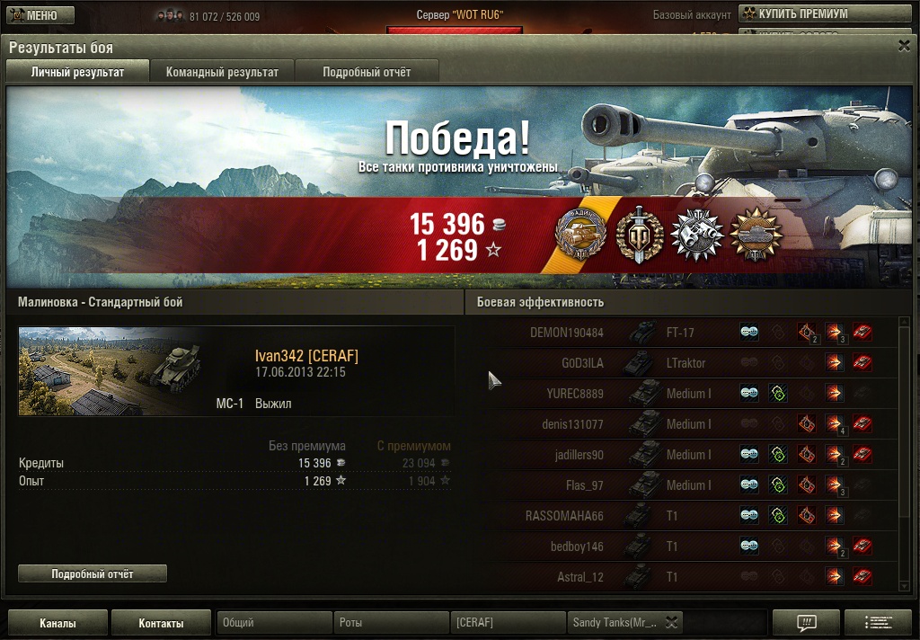 Ivan342 Опубликовано: 17 июня, 2013 Игроки 660 публикаций 45 711 боёв Поделиться Опубликовано: 17 июня, 2013 Опять купил и вот какой подарок мне МоСька приподнёс:P.S.БК тратил по мере игры,но не для медали сам только когда результат смотрел медаль увидел.Победа!Бой: Малиновка 17 июня 2013 г. 22:15:16Танк: МС-1Получено опыта: 1 269Получено кредитов: 15 396Достижения в бою: Медаль Фадина, «Воин», «Дозорный», «Разведчик» Ссылка на комментарий Поделиться на других сайтах Другие способы поделиться...