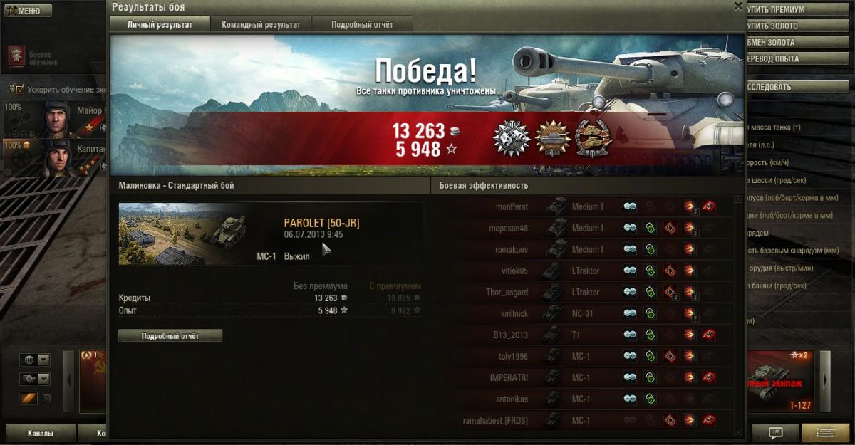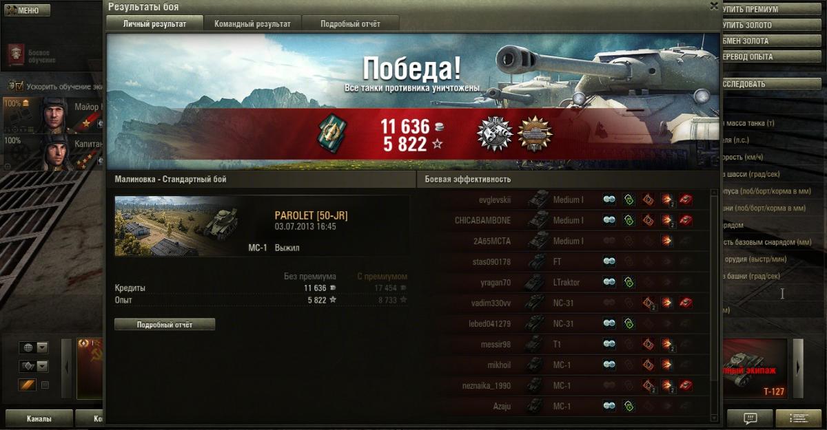_W_O_R_M_I_X_ Опубликовано: 6 июля, 2013 Игроки 1 528 публикаций 3 618 боёв Поделиться Опубликовано: 6 июля, 2013 06 Июл 2013 - 19:50 пользователь PAROLET сказал:Всем Привет!Хорошая сейчас акция. За пару дней взял в 15 боях и дозорного и разведчика. Экипаж вкачался отлично, экономия по боям офигенная - вместо 600 боёв для роста на 1% , откатать пришлось только 50. Теперь 5-е умение стало 91%.эх, а у меня времени не было поиграть во время акции, а сегодня как назло бомбануло: разведчик, дозорный, бронебойщик, стрелок, воин в одном бою:( Ссылка на комментарий