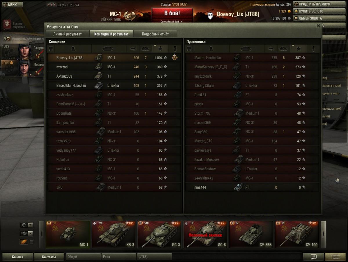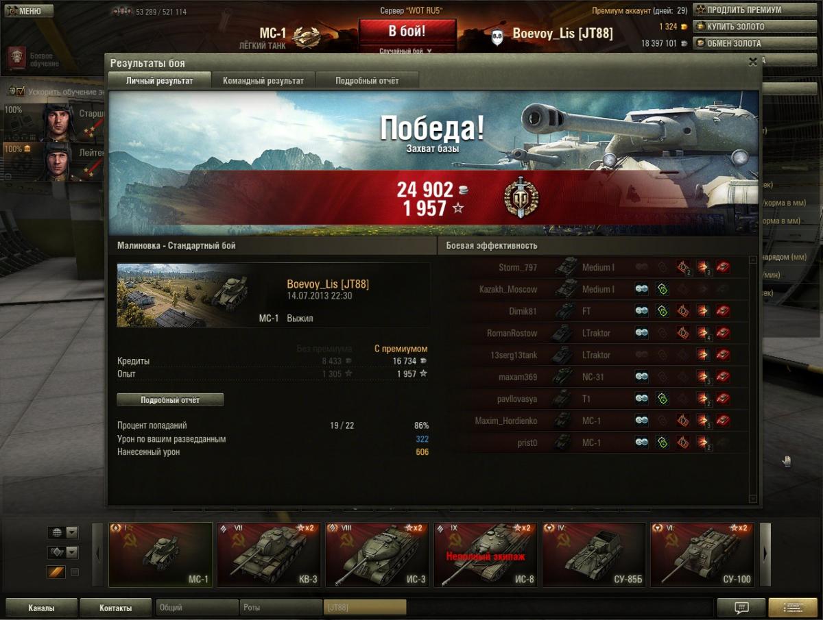 K03JIRN Опубликовано: 14 июля, 2013 Игроки 1 223 публикации 51 878 боёв Поделиться Опубликовано: 14 июля, 2013 (изменено) Да какого лешего я второй день подряд превращаюсь в нуба с 0 боев на аккаунте и соответственно без права писать в этой теме?14 Июл 2013 - 21:49 пользователь grig54 сказал:Спасибо. А я уж хотел мишень рисовать места попадания отмечать. А то тут неверящие были. Интересно у меня один выстрел ушел выше танка явно за круг расброса. Может случайность какая.Если есть желание могу в терньке предоставить широкий выбор динозавров для обстрела с разных дистанций. Там можно будет и проверить.14 Июл 2013 - 21:55 пользователь Boevoy_Lis сказал:Если бы ты знал, как мы стараемся с моськой Вот мы вытащили бой, скрин-анонс. Ребята, у меня к вам есть просьба, посмотрите мою игру :popcorn: Я хотел бы услышать от вас рекомендации, критические замечания и... ну и если похвалите Лиса, я не обижусь даже :eyesup: Отличный бой. Победителей не судят. Единственное пожалуй замечание. Я изначально бы занял позицию в кустиках на F7 (чуть повыше того места, где ты стоял) и светил все болото, а самое главное деревню. Возможно Максимка с 6 фрагами который, засветился бы. Ну и крюк такой через церковь не стал делать, прошел по С6-С5-С4. Если у врага хватило ума рашнуть, ты бы к их базе подошел акурат к концу захвата вашей. Изменено 14 июля, 2013 пользователем K03JIRN 2 "Интересно, наши человеколюбы опять скажут, что Козлян очень грубый, а я хамло?" Мел © Ссылка на комментарий Поделиться на других сайтах Другие способы поделиться...