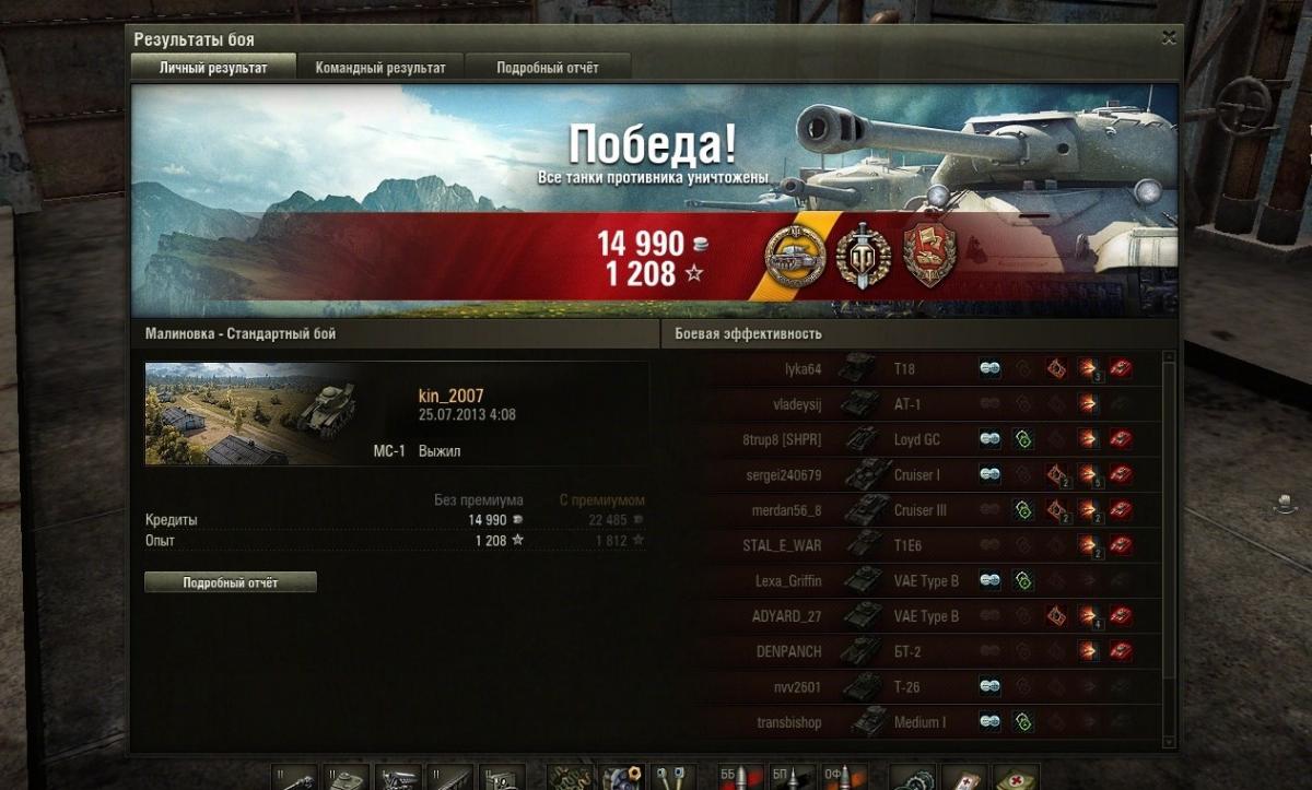 kin_2007 Опубликовано: 25 июля, 2013 Игроки 2 193 публикации 174 260 боёв Поделиться Опубликовано: 25 июля, 2013 (изменено) Не самый интересный бой, но думал, что слили, однако желание захватить базу у 2 лвл оказалось сильнее и повезло, что уцелевшие были нубы (крайнего Крузака убил за 6 сек. до конца боя) и в результате Колобанов :blinky:25 Июл 2013 - 01:29 пользователь Wilde_Gees сказал:Прикольно, после боя сообщение,,,,,Боевая задача выполнена, 1 день премаА у меня времени не хватает набить на прем, хотя призовых голдовых ремкоплектов фактически ежедневно по 10 штучек в подарок Изменено 25 июля, 2013 пользователем kin_2007 Экипаж МС купит домик в Провинции или участок в Малиновке, желательно в районе водоема, дорого, до неприличия дорого. Ссылка на комментарий Поделиться на других сайтах Другие способы поделиться...
