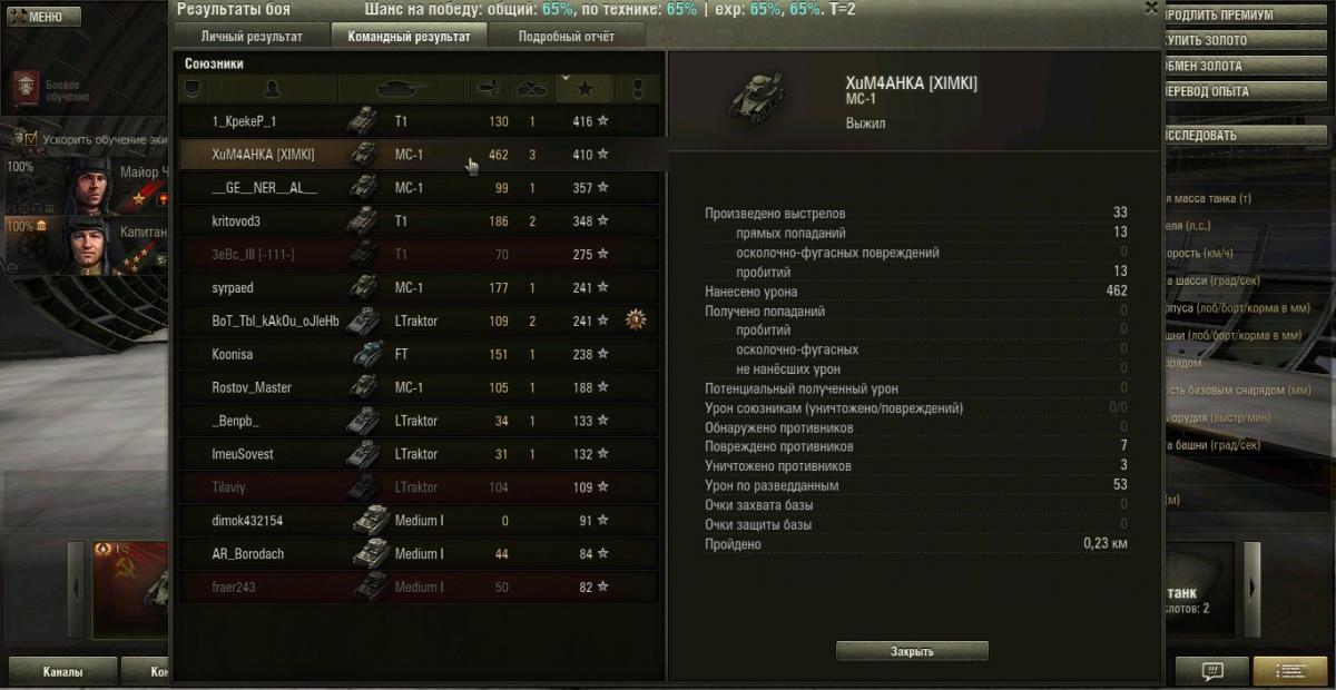 Вот например урона я нанес мало, засвет тоже небольшой. Никого не убил. Но стрелял во всё, что светится. Попадал не попадал. Из пулемета стрелял на 350м. Не пробивал. То есть вел себя активно. За это и опыта дали, что я опередил тех кто фрагов больше имеет и урона больше нанес.