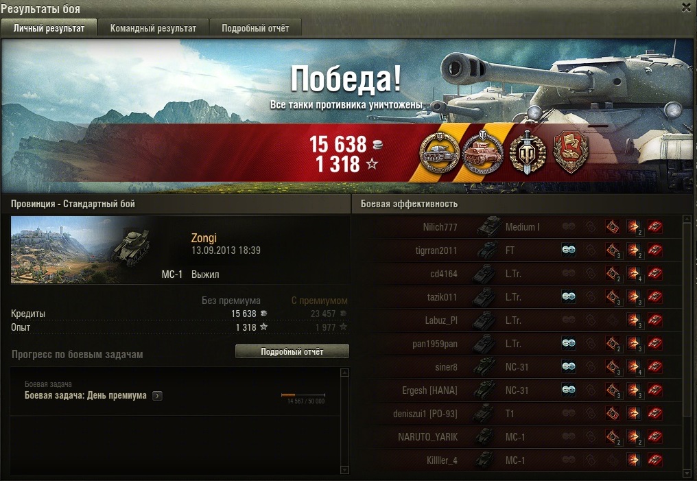 kin_2007 Опубликовано: 14 сентября, 2013 Игроки 2 193 публикации 174 359 боёв Поделиться Опубликовано: 14 сентября, 2013 (изменено) 14 Сен 2013 - 10:38 пользователь Zongi сказал:А мог бы получить больше опыта, что в последний день манёвров ЛТ было бы очень кстати.Да, шанс набрать опыта единиц на 50, а то и все 100 был неплохой, если бы давал ему поднабрать захват и сбивал бы понемного хп каждый раз с него. Хотя после боя легко так рассуждать, а когда ручонки от напряжения потрясывает не до этого порою бывает. Я ставил, что на МоСьке топ-50 будет от 1300 чистого опыта, осталосьчуток подождать подведения итогов. Изменено 14 сентября, 2013 пользователем kin_2007 Экипаж МС купит домик в Провинции или участок в Малиновке, желательно в районе водоема, дорого, до неприличия дорого. Ссылка на комментарий Поделиться на других сайтах Другие способы поделиться...