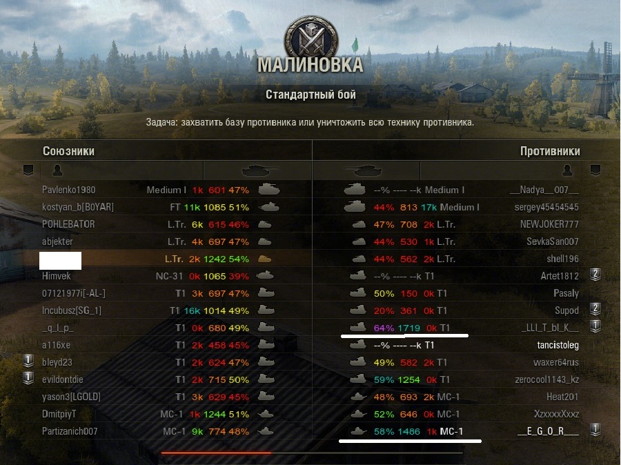 RenamedUser_7554513 Опубликовано: 27 сентября, 2013 Игроки 512 публикации 1 982 боя Поделиться Опубликовано: 27 сентября, 2013 (изменено) 26 Сен 2013 - 11:55 пользователь D__V__K сказал:видеть "отцов" и "раков" чаще всего полезно.26 Сен 2013 - 12:19 пользователь grig54 сказал:Сейчас очень много твинков на 1-2 уровнях. По никам видно.И непонятно что от них ждать.26 Сен 2013 - 13:00 пользователь next99999 сказал:Когда видишь твинк с 0к 1200+ 55%+, то сразу понятно что от него можно ожидать. Также при общем кол-ве боёв 8к+, и пусть даже с 48% уже настораживает. Когда видишь у себя в команде большинство ярко красных по всем показателям можно предположить сразу слив. Когда видишь у противника фиолетовых, хочется с ними побадаться... инфа об игроках для меня лично пользу имеет, потому и называю его пользомером)26 Сен 2013 - 13:21 пользователь lubber сказал:Странно вы оленемер используете... Это хорошая и удобная штука, что бы перед боем оценить, что и как надо делать и кого опасаться.26 Сен 2013 - 13:54 пользователь ZIS_Ural сказал:Вот например, если я играю на Малиновке на верхнем респе и вижу, что у противника одна краснота - поеду в "кусты смерти", а если там два фиолетовых трактора, найду более безопасную позицию. А без оленемера все противники и союзники - коты в мешке. Может они будут полбоя клешнями щелкать, а может фокусить по засвету.В любом случае - это дополнительная информация, если не умеете ей пользоваться - так и скажите.Господа вышеотписавшиеся. Прилагаю скрин с показанием оленемера до боя. Малиновка, сторона пастухов. Прошу обратить внимание на 1-й взвод противников и попытаться объяснить, что надо и чего не надо делать в данной ситуации. Ну и ессно какую полезную информацию можно извлечь из оленемера (пользомера) в течение 30 секунд (где твинки, от кого чего ожидать, как "правильно пользоваться дополнительной информацией" ну и т.д.) Заранее спасибо. http://cdn-frm-eu.wargaming.net/wot/ru/uploads/monthly_09_2013/post-7557380-0-30174000-1380293307_thumb.jpg Изменено 27 сентября, 2013 пользователем stopkran_ Спасибо деду за Победу! Ссылка на комментарий Поделиться на других сайтах Другие способы поделиться...