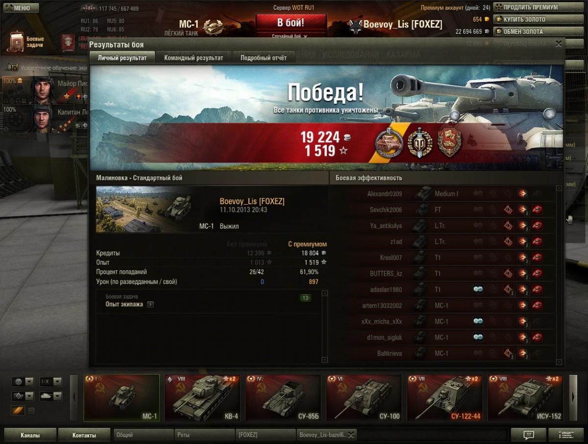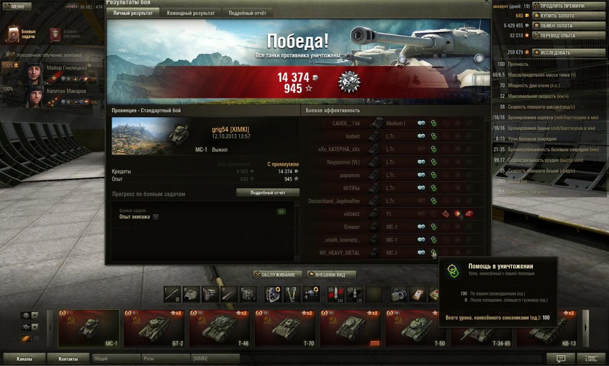 grig544 Опубликовано: 12 октября, 2013 Игроки 2 362 публикации 16 115 боёв Поделиться Опубликовано: 12 октября, 2013 (изменено) Всё-таки Химчанка права. Победа в некоторых случаях зависит от ВБР. А именно куда он тебя кинет на респе. А уже дальше сам. :teethhappy:Удачное использование первоначальной позиции на респе. И ничего более. http://cdn-frm-eu.wargaming.net/wot/ru/uploads/monthly_10_2013/post-13494453-0-74548000-1381576681_thumb.jpgПо моему засвету нанесено урона 876. Это больше половины суммы всех хп противника.======================================SpoilerДовожу до всех, что общими усилиями из монстра(с почти 400 минусами) был сделан человек. :trollface: С пока еще только удовлетворительной репутацией. Но дальнейший рост или падение этой репутации зависит только от него. http://cdn-frm-eu.wargaming.net/wot/ru/uploads/monthly_10_2013/post-13494453-0-66029000-1381589604_thumb.jpg Изменено 12 октября, 2013 пользователем grig544 Knopka () сказал: Снаряд может вести себя довольно фривольно во время полета, но за пределы круга сведения он все равно не выйдет . В нике одна 4-ка лишняя. Отдохнул на курортах Банландии в общей сложности 25 суток. Ссылка на комментарий