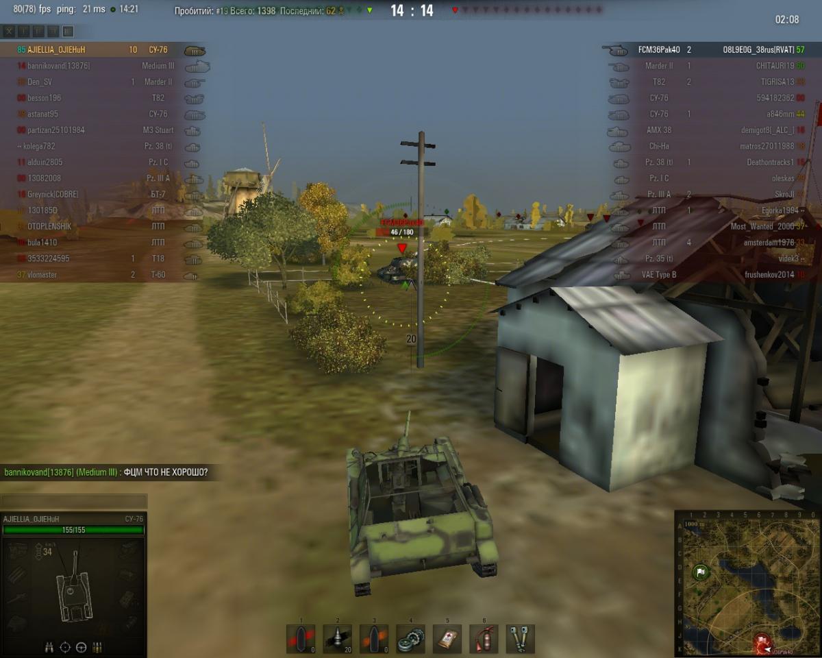 AJIELLIA_OJIEHuH Опубликовано: 16 октября, 2013 Игроки 3 673 публикации 51 084 боя Поделиться Опубликовано: 16 октября, 2013 (изменено) 16 Окт 2013 - 15:19 пользователь grig544 сказал:Что за маскировка у тебя такая? Меньше 93м никак не получается сейчас. Если куст одинарный.А ты не за кустом стой а в кусту.Вот банальный свежий скрин- я вылетаю на фсм стоящего по правилам- за кустом.Если бы он стоял чуть левее и дальше (в кусте возле мельницы) он бы не светился пока я бы не уперся бы в него ренгеном. Я там уже пару раз так сливался об т18.Я к тому что стою я однажды так на поле в кусте, никого не трогаю, не стреляю, врага нет, птички щебечут.Вдруг зажигается лампа и прилетает ваншот из ниоткуда. Я думаю вот оно, вот!И смотрю реплей. А у меня кончик кормы из одного места в кусте торчит( Не накрыло его веточкой( Изменено 16 октября, 2013 пользователем AJIELLIA_OJIEHuH game over Ссылка на комментарий Поделиться на других сайтах Другие способы поделиться...