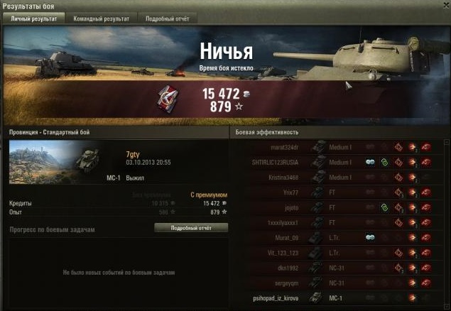 RenamedUser_12848034 Опубликовано: 16 октября, 2013 Игроки 715 публикаций 3 053 боя Поделиться Опубликовано: 16 октября, 2013 16 Окт 2013 - 15:34 пользователь stopkran_ сказал:Жаль нигде не посмотреть как набита стата - взводом или соло. Многое бы прояснилосьэти показатели можно лишь приблизительно определить по дамагу, фрагам и медалям). Ссылка на комментарий Поделиться на других сайтах Другие способы поделиться...