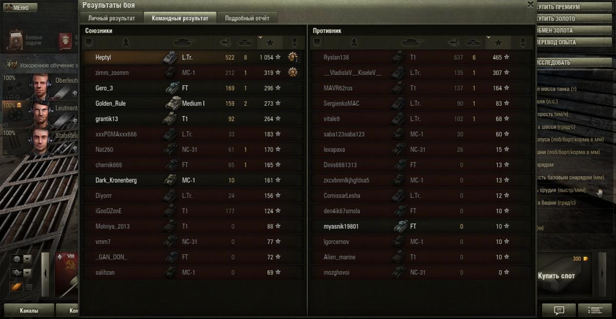 anonym_X1CtWhpGEEzP Опубликовано: 11 ноября, 2013 Игроки 161 публикация 7 811 боёв Поделиться Опубликовано: 11 ноября, 2013 11 Ноя 2013 - 03:59 пользователь Kohlenklaw сказал:Так, с введением командных боёв МСкам стало проще ездить брелоками, так как команды в силу меньшего количества участников плодятся в количестве, быстрее набираются и, при эффективном сетапе, взять один-два первых уровня просто обязаны. Многие МСводы ушли в командные бои? Насколько успешно получается, как с фрагами? Поделитесь, пожалуйста. :)мне командные бои нравятся по сравнению с боями брелком ( мне очень далеко до Вас, Кох, но пробовала)1 преимущество - на респе не сливают) Если не нравится мс в команде - выкидывают.2 - меньше участников боя, в основном все идут на 1 направление, за редким исключением (по сравнению с общим количеством командный боев мало, ну и вообще я нубка ) Исходя из этого, очень большой шанс, пока творится "бодрое танковое рубилово" в одном месте, захватить базу. Если не захватишь, то тем противникам, которые отвлеклись на сам захват, союзники могут стрелять в подставленную часть танкового корпуса .В целом, принимая во внимание мое крайнее нубство, командные бои для мс, пусть рандомные, выгодней обычных, в том отношении, что мс может себя проявить. ИМХО.Выше там свидетельства того, как успешно действует Паролет. 1 Ссылка на комментарий