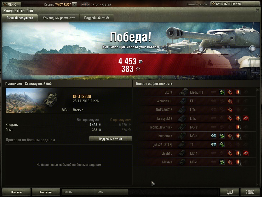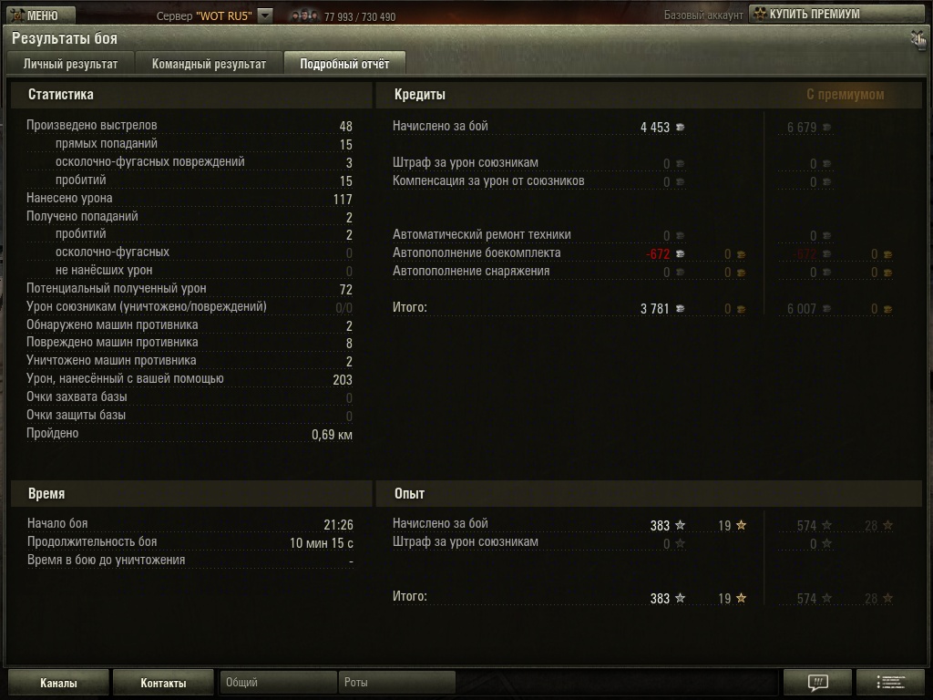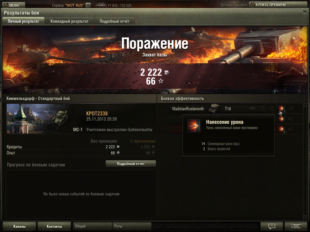 bilileon Опубликовано: 25 ноября, 2013 Игроки 547 публикаций 68 480 боёв Поделиться Опубликовано: 25 ноября, 2013 (изменено) 25 Ноя 2013 - 16:53 пользователь ZIS_Ural сказал:Добавлю про бронированные цели. Т18 можно прекрасно пробивать в ВЛД, с новой точностью это сделать несложно. В борта и корму они пробиваются ББшками отлично. Голду использую только для подстраховки или когда надо устранить противника максимально быстро. Вожу 10 подкалиберных. Учитывая, что Т18 нам на 3 пробития, хватит на 3 Т18, грубо говоря. Поэтому когда их в бою по 5-6, стараюсь не лупить по ним голдой сразу.По поводу "плача Ярославны". Недавно в Малиновке попал в бой, где с каждой стороны по одному игроку с РЭ 1000+ - в моей команде соответственно я, у противника Гоча с РЭ 1600. Когда выяснилось, что он сидит на балконе напротив меня, времени хватало только на то, чтобы кинуть навскидку заряженным бронебойным. Повезло и снаряд пробил его в башню. Естественно начался крик про голдострелов на МС-1 и пр. Потом вражеская команда устроила веселый сливной раш, а затем то же самое предприняла наша команда по деревне. Гоч, сидевший до этого относительно тихо, не считая то и дело возобновляющихся гневных криков в чат, вылез пострелять по нашим нубам и был поставлен на гусеницу и добит теперь уже действительно голдой. Т.к. терпеть его излияния на протяжении боя мне надоело, то я выдал в общий чат фразу "умри, твинкота", т.к. его "страшный" РЭ и происхождение танка уже не вызывали у меня сомнений. К счастью бой закончился чуть менее, чем через минуту, иначе владелец минимауса сломал бы клавиатуру. Статистика игрока не удивила - на аккаунте единственный танк с 21 боем, при 59% побед.Стандартный БК на МС-1 по 50% ББ и голды (27 и 27). Самое то. На голде в 85-90% случаев 1-й уровень шьётся во всех направлениях. Когда сталкиваюсь со вторым, то автоматом переключаю на голду.МС свободно отбивает такие расходы на голду. Подозреваю, что и при 100% голды, всё равно был бы в плюсе (при ПА). Изменено 25 ноября, 2013 пользователем bilileon Ссылка на комментарий