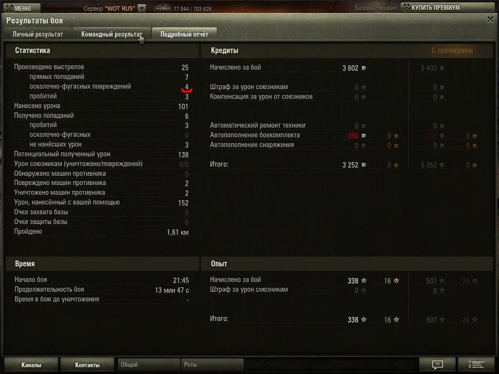 RenamedUser_1484135 Опубликовано: 27 ноября, 2013 Игроки 115 публикаций 1 457 боёв Поделиться Опубликовано: 27 ноября, 2013 26 Ноя 2013 - 23:20 пользователь andryss60 сказал:Зацените вчерашний бой :)http://wotreplays.ru...-andryss60-ms-1На самом деле я не всегда становлюсь в кусты. Если стоишь во второй или третьей линии обороны, то можно встать в пустое место, где никому в голову не придет тебя искать. Под сеткой с камуфляжем будет комфортно вести огонь Для меня бой интересный, но в моём клиенте это постоянная игра с зумом (ближе-дальше) утомляет глаза. 2 Ссылка на комментарий
