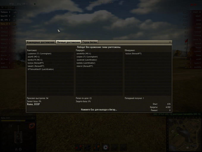 idust Опубликовано: 18 января, 2012 Игроки 177 публикаций 27 123 боя Поделиться Опубликовано: 18 января, 2012 Ностальгия напала вчера по "первачкам". Решил МС-1 в гараж поставить. Посадил на него экипаж с т50 с прокаченной маскировкой в 75%, поставил ему сетку, вентиль, рога.Пушку есессно 45ку. Нажал в бой. Малиновка.Доезжаю до кустов в середине поля и стою)) есть засвет, не стреляю, пусть другие изображают из себя ПТшек ;-)Отошел на кухню, за чаем. Возвращаюсь, в нашей команде жив я и Н35 кажется, ну новый франц.гоч, у них 8 танков, из них пз2 -2 штуки, Бт-2 и еще там кто то. Думаю, настало мое время ;-) Убиваю 5 фрагов, убивают нашего Н35, остаюсь один супротив трех. Стою дальше, враги предвкушая победу, глумятся в чате, дескать, счас и тебя малыш убьем, двое из них едут по полю. Хе-хе, стреляющий куст кладет обоих ;-) Итого 1vs1 остаемся. До конца боя около 4 минут. Постоял немного, решил ехать на их базу. Крадусь, останавливаюсь в кустах до момента чтобы рога сработали, добираюсь до базы, встаю там в кустиках и начинаю захватывать. Последний ПЗ-2 так и не появился более ))Итого: 7 фрагов, Воин, Захватчик и самое приятное и самая первая лычка "Рейдер" ;-) 6 Ссылка на комментарий Поделиться на других сайтах Другие способы поделиться...