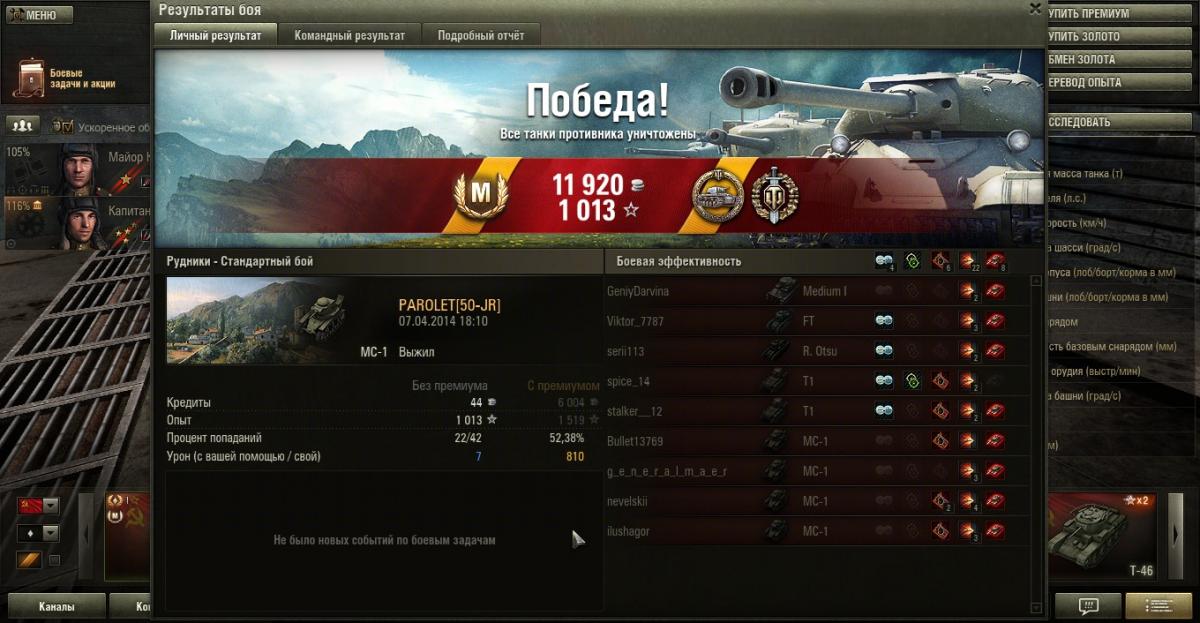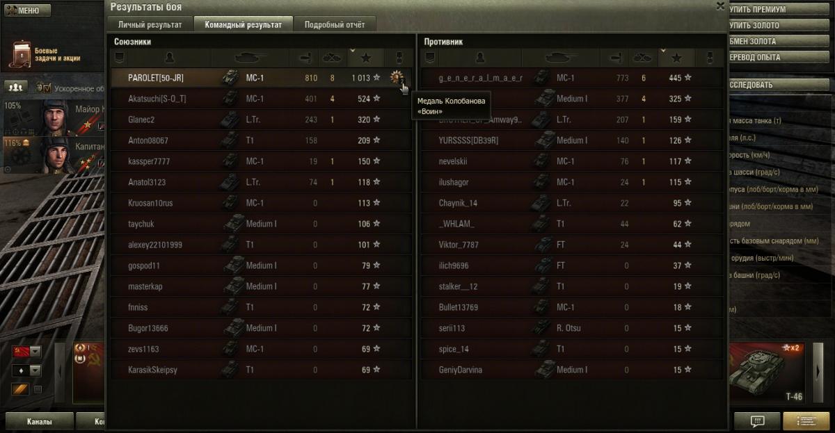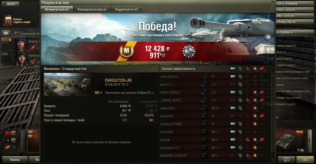 Kohlenklaw Опубликовано: 8 апреля, 2014 Игроки 3 484 публикации 39 763 боя Поделиться Опубликовано: 8 апреля, 2014 08 Апр 2014 - 13:41 пользователь Shougn сказал: Заливаешь, плюсы Т1 главным образом рабят на средней и ближней дистанции, оттуда и мнение о его превосходстве в Химках.Ну так, я же реплей не просто так выложил. Где я там заливал? Решает не танк, решают руки и голова. Может ты невнимательно меня читал, но речь шла о тех, кто однозначно считает, что МС-1 в городе против Т1 не тянет. А большая предрасположенность Т1 к городу, эт само собой. Но не о том ведь речь. Предложение по запуску альтернативной версии игры для любителей классического геймплея: тыц Ссылка на комментарий Поделиться на других сайтах Другие способы поделиться...