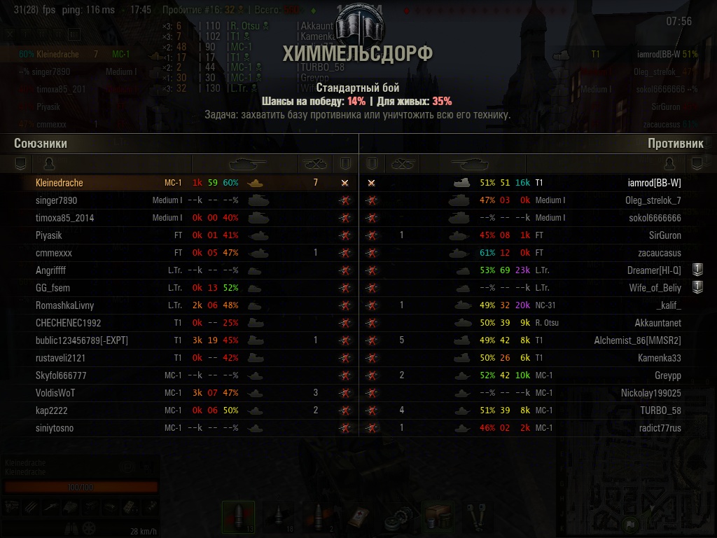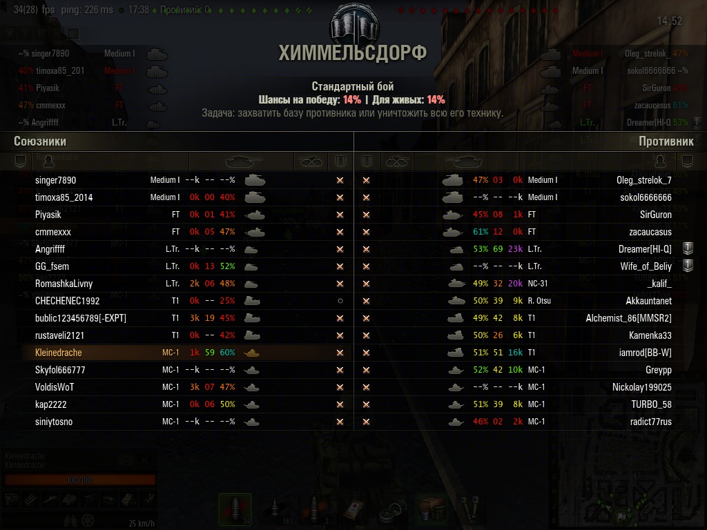 Kleinedrache Опубликовано: 10 июня, 2014 Игроки 233 публикации 2 403 боя Поделиться Опубликовано: 10 июня, 2014 (изменено) 06 Июн 2014 - 12:44 пользователь _Baker сказал:А процент 67 на победу еще весьма щадящий, я обычно не смотрю на него, я смотрю на кол-во сильных игроков в союзниках и соперниках.Меня кидало и с шансом 18% вот это была жесть.Когда-то попытался разобраться, как этот самый прогноз оленемера строится. Понял, что зря теряю время: и пытаясь разобраться в прогнозе, и пытаясь ему доверять. А вот посмотреть на "персоналии" союзников, чтобы представлять, чего от них ждать, считаю -- очень полезно. Нашёл картинки времён попыток разобраться в процентовках.Несмотря на мрачные прогнозы бой проходил довольно ровно, в конце только наша красная армия маленько сдулась. И только когда я остался один на один... с АФК, шансы наши несколько подросли. Я ещё, помню, на сочетание "Защитник"-"Захватчик" в одном флаконе позарился, хотя захват совершенно уже не требовался.http://cdn-frm-eu.wargaming.net/wot/ru/uploads/monthly_06_2014/post-20754010-0-43878500-1402385787_thumb.jpghttp://cdn-frm-eu.wargaming.net/wot/ru/uploads/monthly_06_2014/post-20754010-0-46700000-1402385792_thumb.jpghttp://cdn-frm-eu.wargaming.net/wot/ru/uploads/monthly_06_2014/post-20754010-0-06053300-1402385941_thumb.jpg P. S. Ну что, "Боевые товарищи", запаслись проверенными взводными? Сейчас начнётся "гоу звот". P. P. S. Фух, попустило... Пардонэ муа, невнимательно прочитал новость: взводы засчитываются только одноклановые.Так что "гоу звот" может обостриться только на почве начавшихся каникул. Изменено 10 июня, 2014 пользователем Kleinedrache 2 И это пройдёт. Ссылка на комментарий Поделиться на других сайтах Другие способы поделиться...