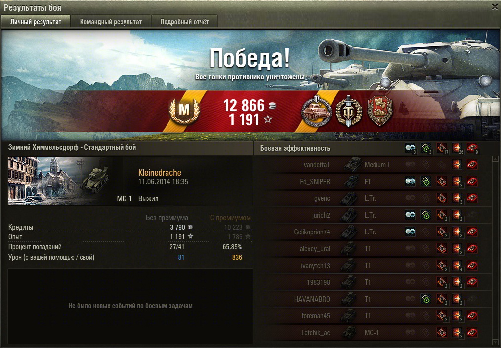 grig54 Опубликовано: 11 июня, 2014 Игроки 6 228 публикаций 49 354 боя Поделиться Опубликовано: 11 июня, 2014 (изменено) 11 Июн 2014 - 18:19 пользователь Malchik_Nagibalchik сказал:Контроль фонтана? )Написали же что это было давно, в далекие времена.11 Июн 2014 - 10:26 пользователь FOXok сказал:Скинешь мне пару реплейчиков с нулевым дамагом и хорошим отсветом... ну и естественно на 1-2 строке по опыту в итоге, буду ждать.Пока один бой только с Дозорным. Правда 3-е место. Но дамаг нулевой. Провинция респ без замка.http://cdn-frm-eu.wargaming.net/wot/ru/uploads/monthly_06_2014/post-10607293-0-93949800-1402511103_thumb.jpgБудет еще.Или Малиновка с неудобным респом или Химки.Это как заказывали. Тоже Провинция, но респ другой:http://cdn-frm-eu.wargaming.net/wot/ru/uploads/monthly_06_2014/post-10607293-0-87122600-1402513511_thumb.jpgЯ думаю достаточно. А то замучался 5 раз по Химкам ездить ради одного боя в Провинции. 9 боев из них 5 Химки.==============Зато вышел на честные, без округления 60% побед на МС-1http://cdn-frm-eu.wargaming.net/wot/ru/uploads/monthly_06_2014/post-10607293-0-18569900-1402514063_thumb.jpg Изменено 11 июня, 2014 пользователем grig54 −−−• − −−− −• •− −−−− •− •••− •• −−•• −• −••− ••−−•• •• −−• •−• •− Фортуна любит смелых, а ВБР красных. ВЕРНИТЕ ПРОВИНЦИЮ-положите туда откуда взяли!!! Враг хитер и коварен. Огонь Провел на курортах Банландии 190 дней Ссылка на комментарий