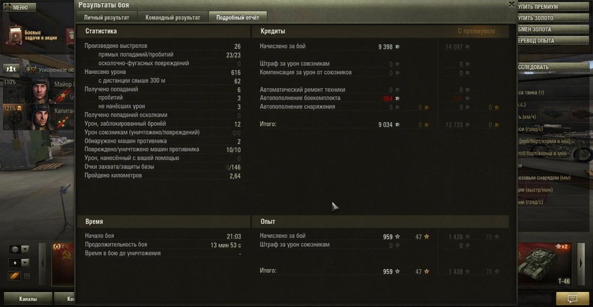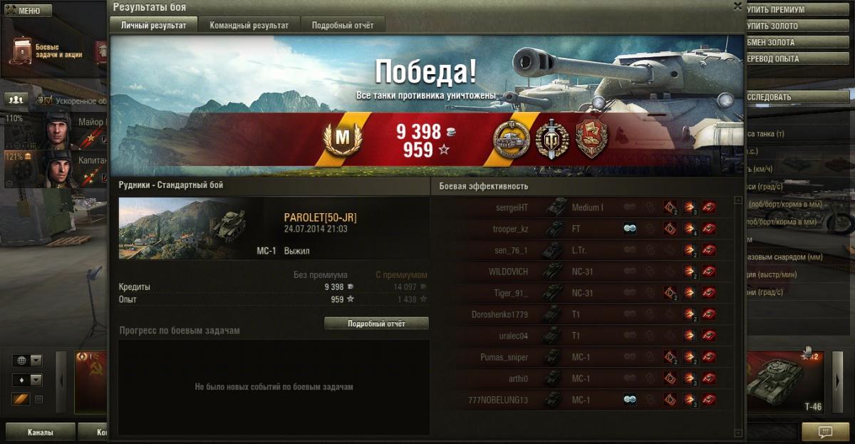 grig54 Опубликовано: 21 июля, 2014 Игроки 6 228 публикаций 49 354 боя Поделиться Опубликовано: 21 июля, 2014 (изменено) 21 Июл 2014 - 12:18 пользователь Kleinedrache сказал:Тоже такое наблюдаю (сначала счёт -- потом убийство). Модов по минимуму, но есть.И вот ещё на неделе приключилось. Захожу в бой. Пошли засветы. Уже перестрелка завязалась с пробитиями.Вдруг -- пауза, чёрный экран, "Обновление ангара", ангар. В статистику смотрю -- не было никакого боя, показалось... Участвовал в какой то акции по легким танкам. Очень много набил. Явно по опыту попадал в топ50. Выкинуло с сервера прямо перед окончанием и никаких результатов боя. Ну и никуда я не попал естественно. Так и не знаю то ли я мало опыта набрал то ли просто результаты мои исчезли. Но медалек не добавилось а они явно должны были быть. Изменено 21 июля, 2014 пользователем grig54 −−−• − −−− −• •− −−−− •− •••− •• −−•• −• −••− ••−−•• •• −−• •−• •− Фортуна любит смелых, а ВБР красных. ВЕРНИТЕ ПРОВИНЦИЮ-положите туда откуда взяли!!! Враг хитер и коварен. Огонь Провел на курортах Банландии 190 дней Ссылка на комментарий Поделиться на других сайтах Другие способы поделиться...