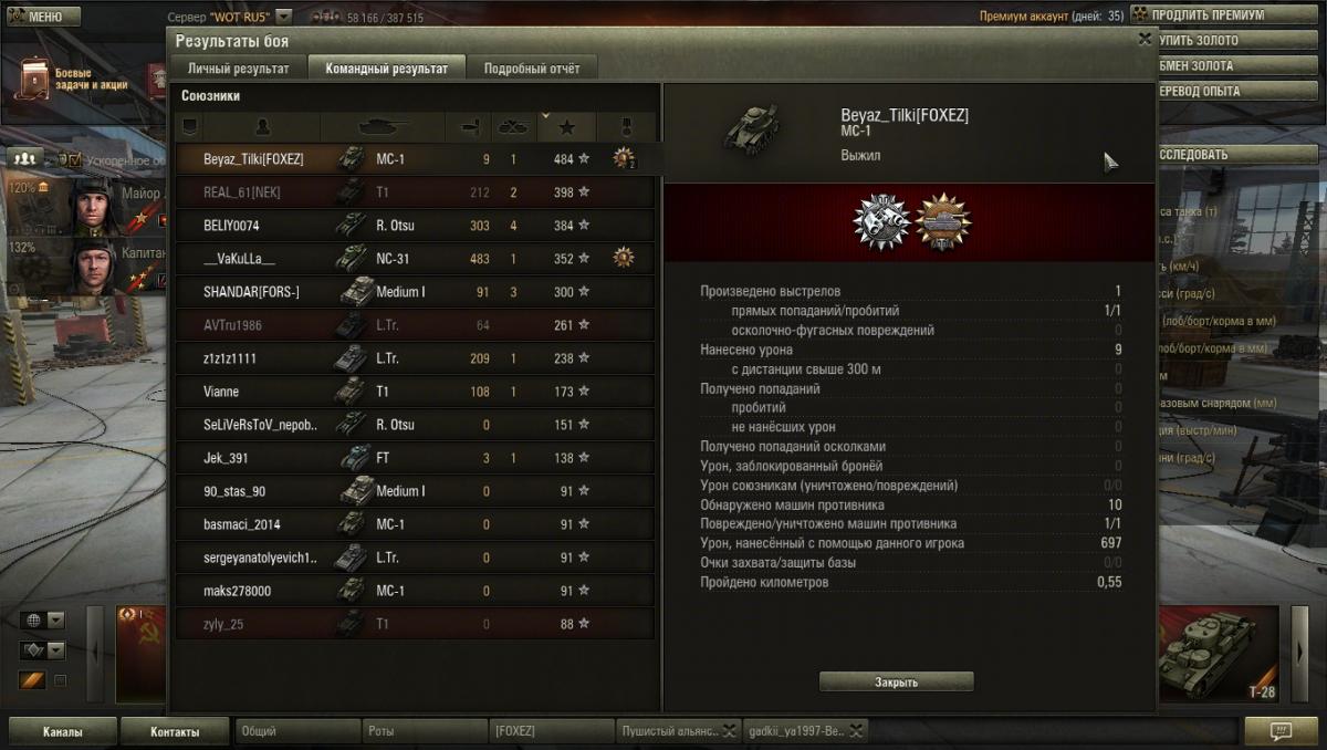 Маньяки блин))) С вами даже в одной ветке форума страшно сидеть - ИСы они на Моське бьют, блин, мне даже жутко представить, снимаю свою рогатую шляпу и перчатки-клешни)) Мое персональное достижение на Мосе - немецкий Трюхбрюхваген-II 4-го уровня, меня к нему затащил дружбан-совзводный, который поторопился жмякнуть "к днищам!" а я не пересел на другой танк..Ну что, поехал на МС, красная команда там от избытка юмора в комментах чуть не обмочилась, а наши мне сразу - свети, свети..Ога, светляк я на 4-м уровне с моей скоростью..Ну поперся по краю карты, любимый маршрут в безвыходных ситуациях..Еду, а тут какой-то коцаный и слепой этот самый ваген выезжает, ну забрал его, а потом арта. Но тем не менее, без голдосика)