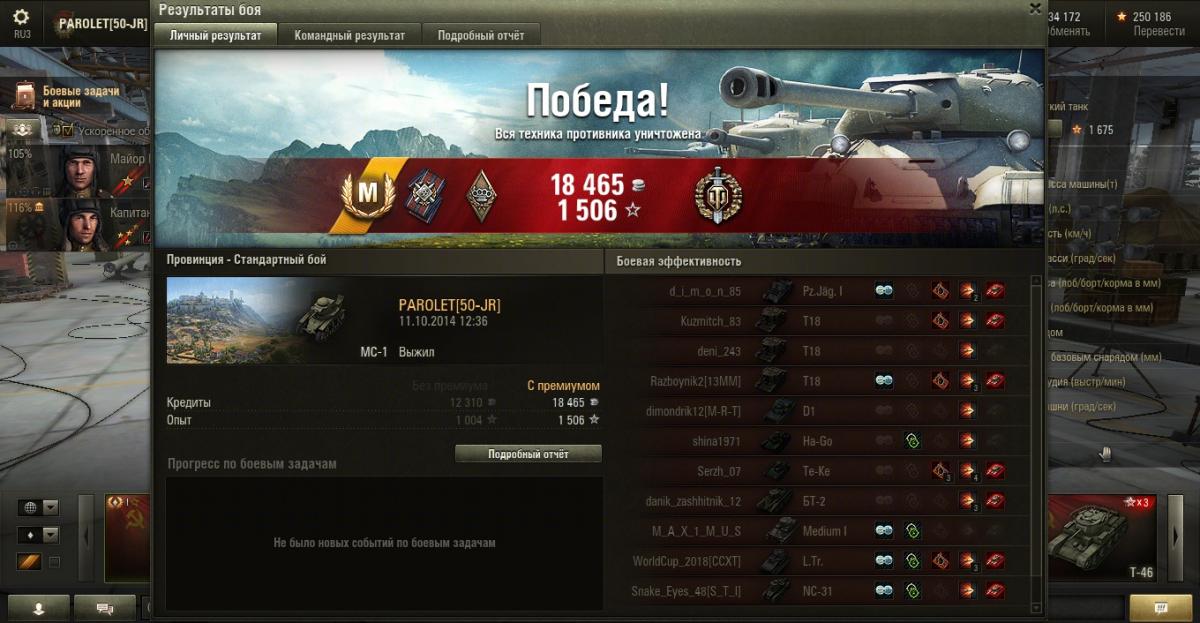 PAROLET Опубликовано: 11 октября, 2014 Игроки 8 400 публикаций 207 965 боёв Поделиться Опубликовано: 11 октября, 2014 (изменено) А сегодня всё отлично - лагов нет (тьфу-тьфу). С первых боёв ига идёт успешно.Неплохо отыграл в Провинции, правда жаль ПТ соперника - лишил его Победы.http://wotreplays.ru/site/3818278#provinciya-parolet-ms-1 Изменено 11 октября, 2014 пользователем PAROLET 5 Aut cum scuto, aut in scuto! Ссылка на комментарий Поделиться на других сайтах Другие способы поделиться...