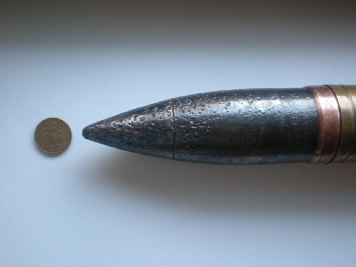 Ну да, сколько там лет с войны прошло? Бронебой, к слову, не остроконечный, а тупоконечный, чуть ли не плоский. То, что выглядит как острый конец, на деле, баллистический колпак (на фото риска видна). Теперь наглядно понятны пределы пробиваемости - снаряд броню больше проламывает, чем протыкает, а такая мелкая гильза вмещает недостаточно заряда, чтобы это сделать с по-настоящему толстой бронёй.