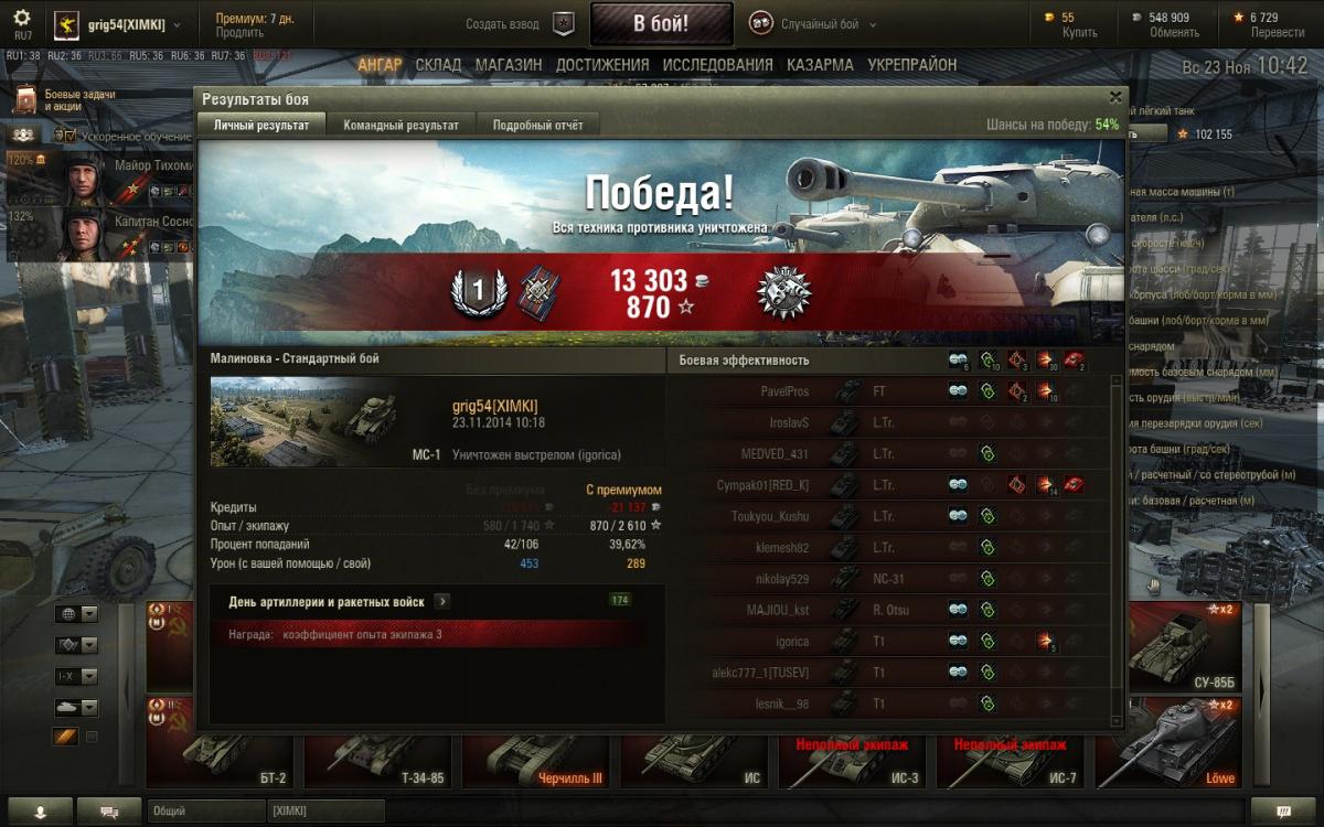 AlterXanadu Опубликовано: 23 ноября, 2014 Игроки 2 478 публикаций 27 852 боя Поделиться Опубликовано: 23 ноября, 2014 (изменено) 23 Ноя 2014 - 13:19 пользователь grig54 сказал: Один бой на МС-1 с ТНШ это минус 20к серебра.Ах! Вот оно что! А подвижности хватает биться с пулеметом на передовой?Честно признаюсь очень давно не выкатывал МС-1. Но если учесть, что МС-1 был танком на котором я вообще не знал как играть (43пп), потом продал его, потом выкупил и снова покатался чуть-чуть - былые показатели отношение нанесенного/полученного урона (при том же проценте попаданий) выглядят получше, чем с пулеметом. Изменилось ли сейчас что-то для 45мм, потеряла ли она былые характеристики? Если ТНШ для фана, то могу порекомендовать Т7 комбат кар - очень забавный пулеметный агрегатик. Да и прибыль будет приносить. Изменено 23 ноября, 2014 пользователем AlterXanadu 1.Шухер посоны, банщики окружают. 2. Я уважаю интересы команды. Если команда льется - я всегда поддерживаю и присоединяюсь. 3. У меня было 44 медальки "Надежный боевой товарищ" - осталось 2 - я сам к себе проникаюсь все большим уважением)) 4. Играю для удовольствия. Бои тащить - нервной системе вредить. Играть без напряга намного приятней. Ссылка на комментарий Поделиться на других сайтах Другие способы поделиться...