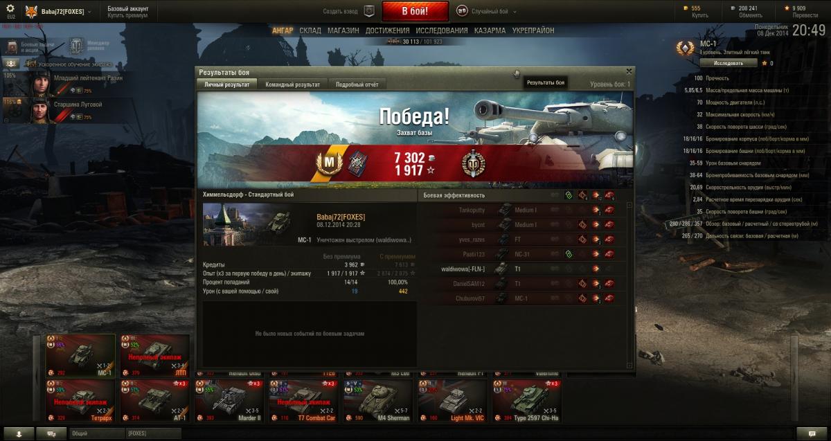 Babaj_72 Опубликовано: 8 декабря, 2014 Игроки 772 публикации 69 703 боя Поделиться Опубликовано: 8 декабря, 2014 (изменено) 08 Дек 2014 - 09:21 пользователь Beyaz_Tilki сказал:...Там всё самое интересное происходит в ближнем бою, когда моська крутится вокруг толстого тяжика и ВЫЦЕЛИВАЕТ уязвимые точки, разгрызая противника на куски.... Хороший брелок в команде - это и польза, и заряд хорошего настроения для команды - потому что всем довольно интересно смотреть, как маленьких танчик убивает танчик большой... Только этот самый заряд настроения команде приходит тока после того, когда Моська начинает уверенно грызть "слона"...Или уже кого-либо загрызет...Тогда команда начинает вкупаться, что брелок - это польза и фан. И , главное в бою, что бы брелок дожил до этого момента...А то бывало и по 4-6 трупов организовывалось на респе сразу после начала боя, после выноса брелка...http://cdn-frm-eu.wargaming.net/4.3/style_emoticons/wot/Smile_izmena_jap.gifp.s.Получился довольно неплохой бой в Химках. http://cdn-frm-eu.wargaming.net/wot/ru/uploads/monthly_12_2014/post-1642683-0-57679500-1418050283_thumb.jpghttp://cdn-frm-eu.wargaming.net/wot/ru/uploads/monthly_12_2014/post-1642683-0-38956000-1418050270_thumb.jpgВот реплей. - http://wotreplays.ru/site/4169594#himmel_sdorf-babaj_72-ms-1Получилось прикрыть направления, где уже все союзники либо слились, либо их не было.)))Правда меня переиграл вражеский Т1, зайдя в тыл, но в итоге союзники смогли захватить базу..Описание Поехал на дорогу вдоль железки. Дождался, зачистил NC-31 и Меда. По миникарте проскочил засвет спускающегося с горы противника. Отход на базу и ... неожиданный конец для вражеского шустрого МС-1. Следом - удачная постановка летящего с горы вражеского пулеметчика Т1 на гусли и расстрел. Уничтожение FТ и одникого Меда в кишке...И, к сожалению, заход с кормы вражеского пулеметчика на Т1... Отстрелялся как мог, но сгорел...И самое интересное - Т1 был на захвате, уничтожил нашего защитника ... и бросил захват, то ли пытаясь успеть за 10 сек до своей базы, то ли повелся на призыв взять воина.. Итог - союзники захватили базу, хотя практически с начала боя счет был сливным... Изменено 8 декабря, 2014 пользователем Babaj_72 - Даешь Гвоздева!!! Пользователь сказал: ... Wargaming не обязана предоставлять Пользователю доказательства, свидетельствующие о нарушении Пользователем условий Соглашения, в результате которого Пользователю был прекращён или ограничен доступ.... http://wots.com.ua/u...2/signature.jpg Ссылка на комментарий Поделиться на других сайтах Другие способы поделиться...