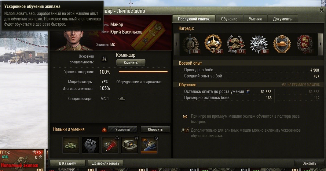next99999 Опубликовано: 21 февраля, 2015 Игроки 3 397 публикаций 14 160 боёв Поделиться Опубликовано: 21 февраля, 2015 21 Фев 2015 - 11:17 пользователь grig54 сказал:Играю 50% с премом 50% без. 10+к боев на МС-1. По моему уже 6-й экипаж качаю. Один докачал до 5 перков остальные 3,5-4+. Сейчас имею у командира на 6-м экипаже 3,8 перка правда экипажhttp://cdn-frm-eu.wargaming.net/4.3/style_emoticons/wot/Smile_girl.gif http://cdn-frm-eu.wargaming.net/4.3/style_emoticons/wot/girl_support.gif. Первый бой экипажа 10.02. 2 перка изначально было. Пользуюсь акциями по прокачке. Пересаживаю экипаж. 5-й перк например докачивал на Т-60. На него акция была долго. ЛТП и Валю использую активно. Но тогда заряжающего беру с 4+ перками чтобы весь доп.опыт экипажу МС-1 падал. Сегодня например экипажем звезды снял на МС-1, ЛТП и Вале. Так экипаж качается довольно быстро. А если один экипаж держать то для 6-7 перка можно бесконечно качать. Да и не надо столько перков 4-5 достаточно вполне. Докачаю экипаж до 4,5 перка и пересажу. Новый буду качать. МС-1 у меня что-то типа учебки. Почему МС? По простой причине: главные перки у командира и мехвода. У остальных кроме ББ и маскировки и нет ничего полезного. А эти перки быстро прокачиваются на любом танке.http://cdn-frm-eu.wargaming.net/wot/ru/uploads/monthly_02_2015/post-12884265-0-51062000-1424518375_thumb.jpg Основной Калибр это на ЛТП, Стальные стены на Валентайне Тоже гибрид. Ну ладно, понял что ответа не будет - ибо вопрос слишком специфичен. Точного ответа никто не даст, ибо кто-то с премом играет через раз, кто-то прокачивает экипаж на прем танках как получится. СПС за внимание - удаляюсь на времяhttp://cdn-frm-eu.wargaming.net/4.3/style_emoticons/wot/Smile_Default.gif УДАЛИТЕ МИТТЕНГАРД, ВЕРНИТЕ ПРОВИНЦИЮ, верните малиновку в "песок" Ссылка на комментарий