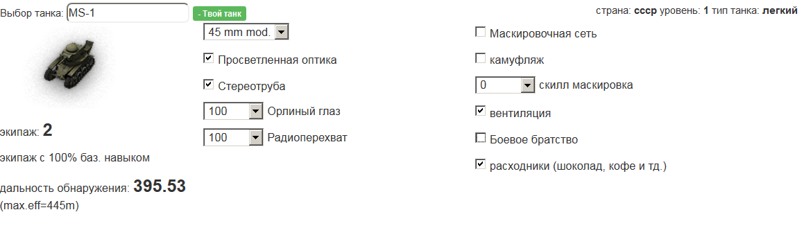_Baker Опубликовано: 17 августа, 2015 Игроки 1 168 публикаций 45 265 боёв Поделиться Опубликовано: 17 августа, 2015 (изменено) 17 Авг 2015 - 17:55 пользователь Ivan342 сказал:Друзья! Возник вопрос. Кто-нибудь проводил замеры обзора МС-1 с прокаченным экипажем? Меня интересует каков будет обзор с перками у командира Орлиный глаз и Радиоперехват, объединённых со Стереотрубой и Просветлённой оптикой и Доппаёком. Заранее спасибо.P.S PAROLET и grig54 большой привет.http://cdn-frm-eu.wargaming.net/4.4/style_emoticons/wot/Smile_honoring.gif Труба и оптика не суммируются, поставил для расчета вентиль.http://cdn-frm-eu.wargaming.net/wot/ru/uploads/monthly_08_2015/post-2962553-0-30499600-1439826641_thumb.pngБез вентиля примерно 386,5 м. будет.Вкачешь ББ, еще + 10 м добавится. Максим можно выжать 404,5 Изменено 17 августа, 2015 пользователем _Baker Вернете Провинцию, начну играть. Ссылка на комментарий