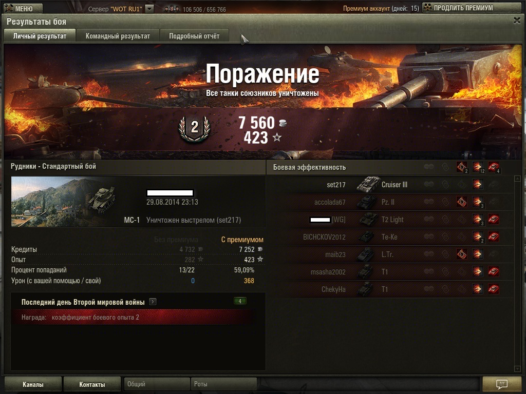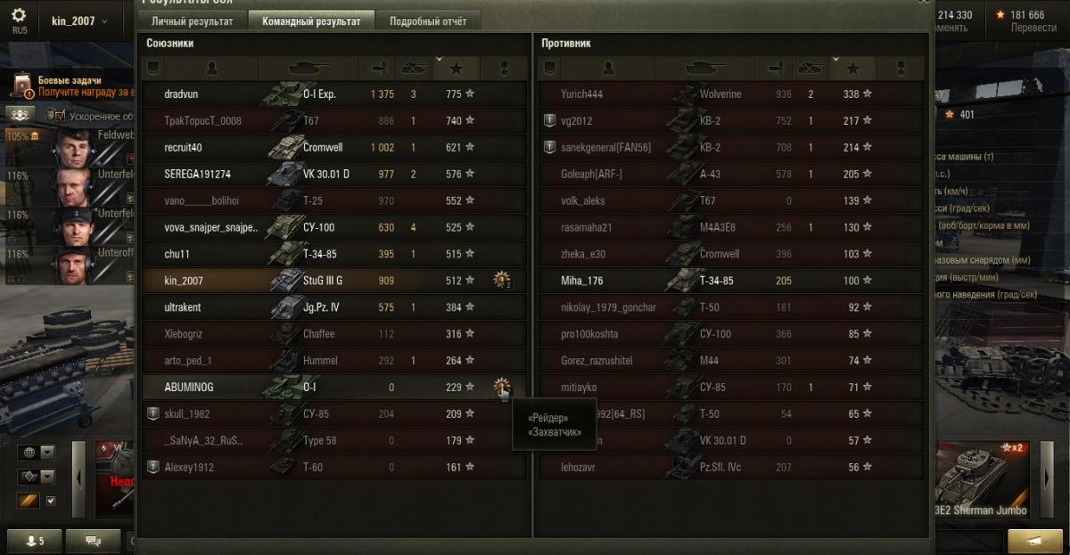 kin_2007 Опубликовано: 16 сентября, 2015 Игроки 2 193 публикации 174 234 боя Поделиться Опубликовано: 16 сентября, 2015 По поводу Рейдера. На 1-2 лвл его сейчас, фактически, невозможно взять (по крайне мере, на Миттенграде уж точно, получалось на нём только захватчика брать). А вот на других картах запросто - пример на скрине, когда самый "незаметный" и "быстрый" танк в командах взял Рейдера. Экипаж МС купит домик в Провинции или участок в Малиновке, желательно в районе водоема, дорого, до неприличия дорого. Ссылка на комментарий Поделиться на других сайтах Другие способы поделиться...