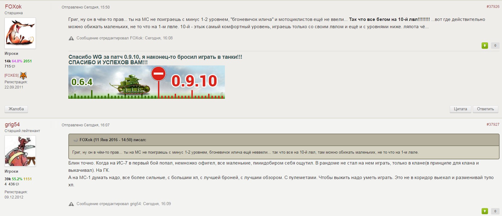 next99999 Опубликовано: 14 января, 2016 Игроки 3 397 публикаций 14 160 боёв Поделиться Опубликовано: 14 января, 2016 14 Янв 2016 - 11:05 пользователь Mstiv сказал:Какая удобная функция. http://cdn-frm-eu.wargaming.net/wot/ru/uploads/monthly_01_2016/post-1168678-0-40315600-1452769510_thumb.jpgЕсть что по сути сказать?Зы: о жалобах не ко мне - ибо сам"жертвой" жалоб себя чувствую порой - но забыл когда уже этой "функцией" пользовался УДАЛИТЕ МИТТЕНГАРД, ВЕРНИТЕ ПРОВИНЦИЮ, верните малиновку в "песок" Ссылка на комментарий Поделиться на других сайтах Другие способы поделиться...