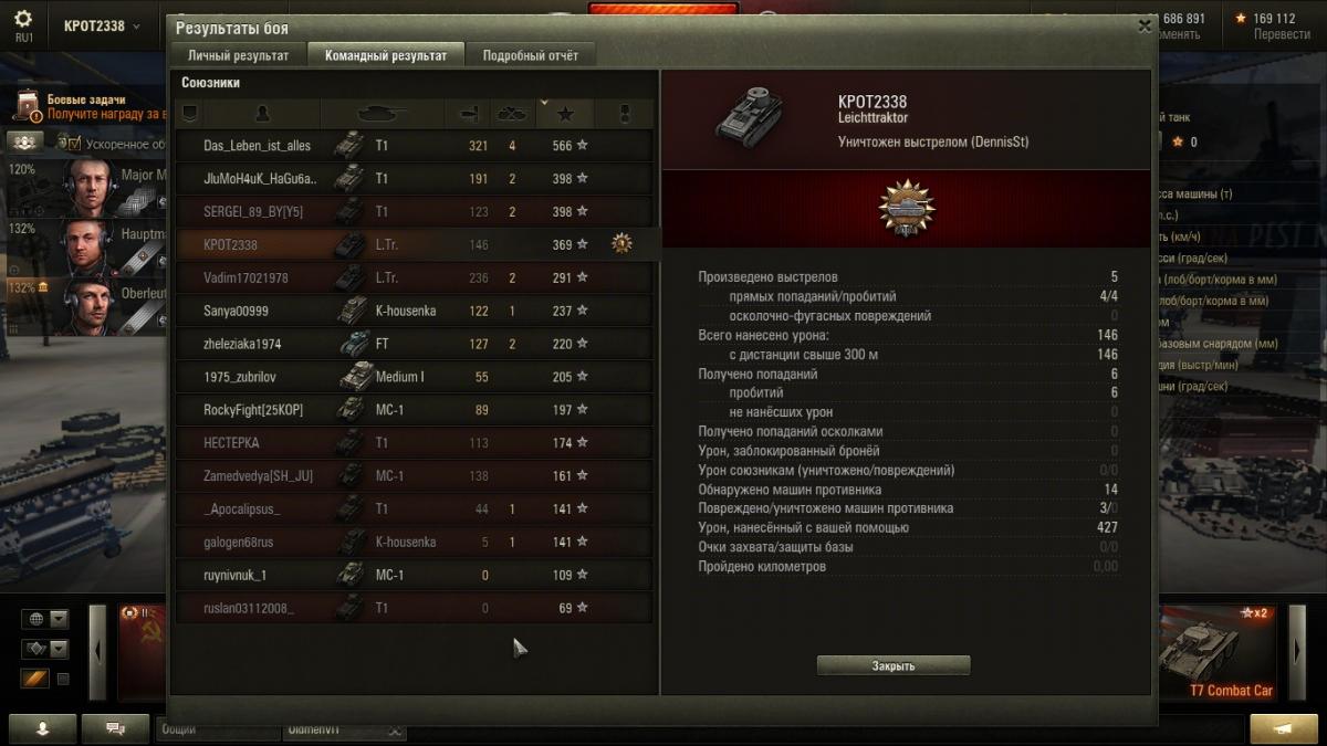 RenamedUser_26294993 Опубликовано: 24 января, 2016 Игроки 197 публикаций 140 боёв Поделиться Опубликовано: 24 января, 2016 (изменено) 24 Янв 2016 - 20:53 пользователь KPOT2338 сказал:..................................................Вообще никогда так не играл (если это можно назвать "играл" ). Просто раз при вылете взял разведчика.А на прошлой странице кто-то усомнился, что можно взять разведчика, абсолютно ничего не делая.Пришлось доказывать.А тут ещё и дозорный прилетел. По Т1 руки чесались пальнуть, но прикинул, что и так победа и не стал стрелять.Но я вот что не понял.Если он меня видел, то почему стрелял по японцу?У него ж броня в 3 раза толще, а меня мог сразу забрать, как потом и сделал.А если не видел, то кто меня обнаружил? Насчёт взять их через раз.Я так понял, что их - это обоих вместе?Уточни пожалуйста сколько у тебя дозорных в Миттенгарде. з.ы.: У одного из пяти(?) кота на аватарке нетТот, который без аватарки - это прародитель, ему аватарка не нужна - достаточно подписи.....................................Сколько дозорных и разведчиков в Миттенгарде на ЛТР не считал специально, но почти каждый второй бой там были (у меня же ЛТР прокачанный там, да ещё с Маскировкой да плюс труба) . На МС-1 конечно похуже, но тоже бывало. Извини - уточнить уже не смогу : поверь на слово если сможешьИ да - они там берутся почти всегда одновременно , в случае победы.......................................Почему Т1 - тебя сразу не "забрал"?Да наверно потому, что не знал ещё, что японец ему "не по зубам", хотя и ближе был А может подумал что ты бот или АФК - и ни какой угрозы для него не представляешь...............................Кто тебя обнаружил мы узнаем только если увидим рипы твоих противников. А раз уж ты засветился даже не им, то он тебя по-любому должен был видеть. Хотя пересмотрев думаю он засветил - кроме него походу некому было, а по японцу били активно - вероятно кто-то "помечал цель" Изменено 24 января, 2016 пользователем next_99999 удалите МИТТЕНГАРД, ВЕРНИТЕ ПРОВИНЦИЮ ОБРАТНО, И МАЛИНОВКУ для "песка" Ссылка на комментарий Поделиться на других сайтах Другие способы поделиться...