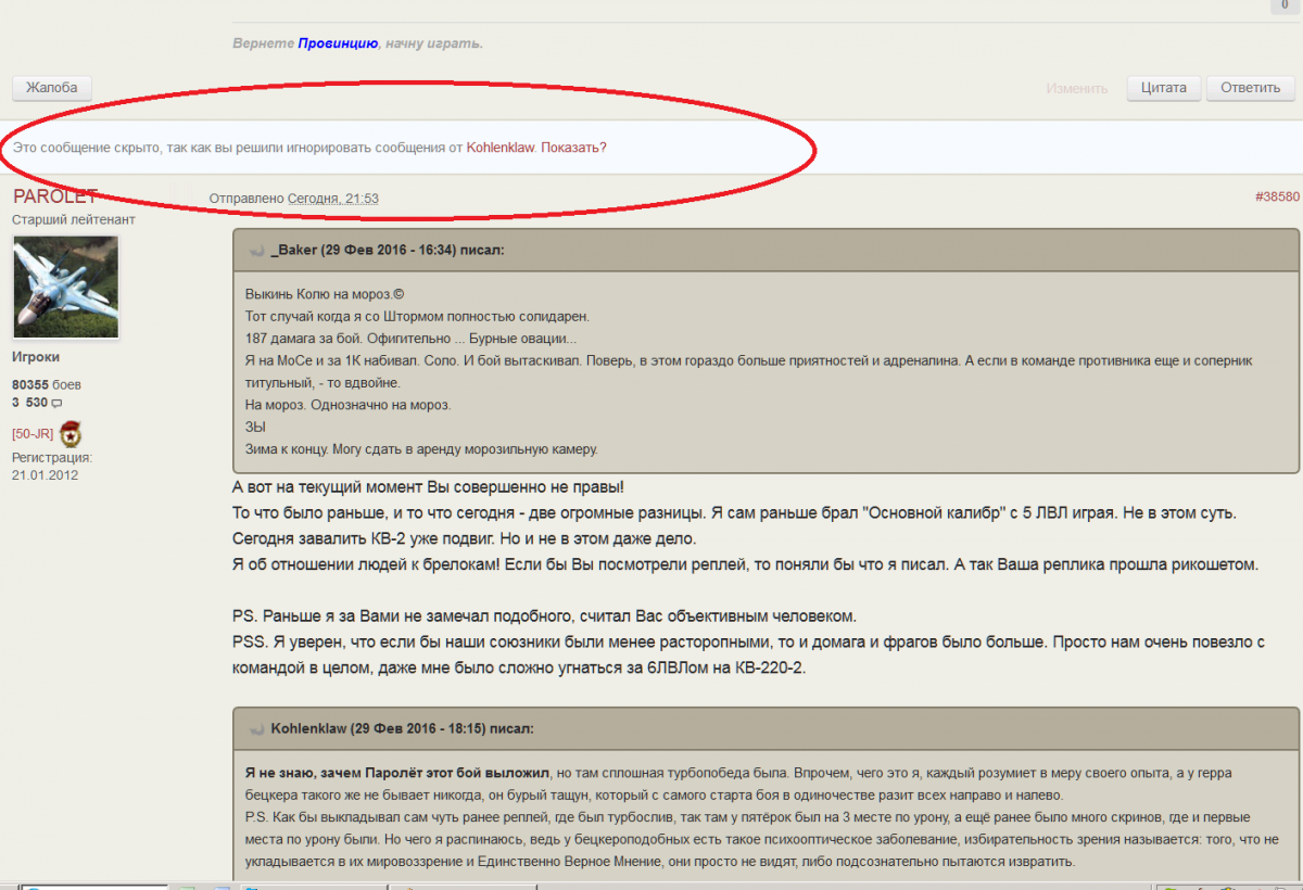 _Baker Опубликовано: 29 февраля, 2016 Игроки 1 168 публикаций 45 265 боёв Жалоба Поделиться Опубликовано: 29 февраля, 2016 (изменено) 29 Фев 2016 - 21:53 пользователь PAROLET сказал:А вот на текущий момент Вы совершенно не правы!То что было раньше, и то что сегодня - две огромные разницы. Я сам раньше брал "Основной калибр" с 5 ЛВЛ играя. Не в этом суть.Сегодня завалить КВ-2 уже подвиг. Но и не в этом даже дело.Я об отношении людей к брелокам! Если бы Вы посмотрели реплей, то поняли бы что я писал. А так Ваша реплика прошла рикошетом. PS. Раньше я за Вами не замечал подобного, считал Вас объективным человеком.PSS. Я уверен, что если бы наши союзники были менее расторопными, то и домага и фрагов было больше. Просто нам очень повезло с командой в целом, даже мне было сложно угнаться за 6ЛВЛом на КВ-220-2. 1. Показать насколько люди ошибаются про брелоков.2. Показать что и сегодня МС-1 способен снимать скальпы с "Железных капутов".3. Выразить своё уважение своему наставнику.Первый скрин подтверждает, что я правильно сделал. Кроме желчи ничего нового.Второй скрин, сам за себя все говорит.Привет наставнику У меня кот больше в среднем набивает ..ЗЫСпасибо, если бы не скрин (ч/з клиент), через месяц пароль уже бы и не вспомнил http://cdn-frm-eu.wargaming.net/wot/ru/uploads/monthly_02_2016/post-2962553-0-64624100-1456773719_thumb.pnghttp://cdn-frm-eu.wargaming.net/wot/ru/uploads/monthly_02_2016/post-2962553-0-51257500-1456773742_thumb.jpgЗЫ ЗЫИ это единственный форум, который я знаю, где сознательное коверканье ника с целью оскорбления, не пресекается.Привет наставнику ... Изменено 29 февраля, 2016 пользователем _Baker 2 Вернете Провинцию, начну играть. Ссылка на комментарий Поделиться на других сайтах Другие способы поделиться...