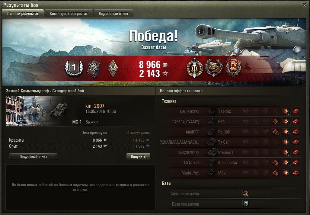 kin_2007 Опубликовано: 16 мая, 2016 Игроки 2 193 публикации 174 244 боя Поделиться Опубликовано: 16 мая, 2016 16 Май 2016 - 13:30 пользователь FOXok сказал:Но припоминаю, бывало и в районе 650 брался "Мастер" в былые времена.Мастер брался в интервале от 655 до 700 стабильно и это с учётом Малиновки и Провинции. При нынешних картовых раскладах он объективно должен "капать" при 550-650 чистого опыта. Экипаж МС купит домик в Провинции или участок в Малиновке, желательно в районе водоема, дорого, до неприличия дорого. Ссылка на комментарий Поделиться на других сайтах Другие способы поделиться...