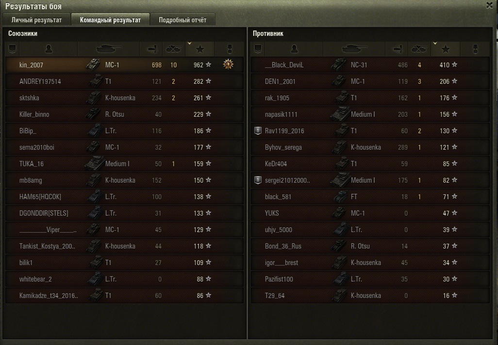 grig54 Опубликовано: 25 мая, 2016 Игроки 6 228 публикаций 49 354 боя Жалоба Поделиться Опубликовано: 25 мая, 2016 25 Май 2016 - 06:27 пользователь KPOT2338 сказал: Тогда десятки замучаются в очереди висеть. Уж если ограничивать, то я б сделал наоборот 7-5-3.3 танка топового для этого боя могут быть ТТ или ЛТ или САУ. И если в одной команде будет 3 САУ10, а в другой 3 СТ10 ни о каком балансе и речи быть не может. Значит баланс должен быть по уровню и по типам. И нельзя сделать 3-5-7 или 7-5-3. Кто-то будет очень долго висеть в очереди. Реально 3-5-7 или 4-4-7 или 5-5-5 и т.д. различные варианты в соответствии с составом очереди на случайный бой. То есть переменные Х-У-Z в зависимости от соотношения уровней и типов техники. Причем еще должны быть одноуровневые бои и бои уровнем +1. −−−• − −−− −• •− −−−− •− •••− •• −−•• −• −••− ••−−•• •• −−• •−• •− Фортуна любит смелых, а ВБР красных. ВЕРНИТЕ ПРОВИНЦИЮ-положите туда откуда взяли!!! Враг хитер и коварен. Огонь Провел на курортах Банландии 190 дней Ссылка на комментарий Поделиться на других сайтах Другие способы поделиться...