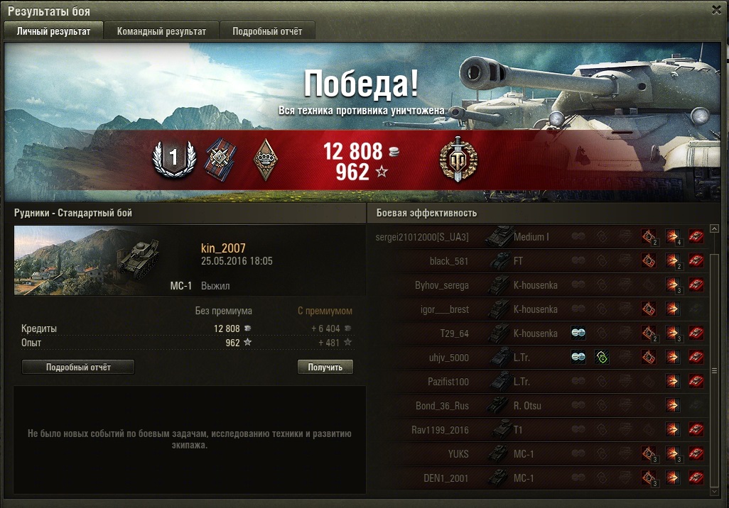 Heptyl Опубликовано: 26 мая, 2016 Игроки 598 публикаций 10 715 боёв Жалоба Поделиться Опубликовано: 26 мая, 2016 26 Май 2016 - 03:28 пользователь kin_2007 сказал:Да не, он первый по опыту и дамагу (360 с гаком, кажется,дамага) в своей команде был. Пару нелестных слов, конечно, в свой адрес услышал, но потом в лс всё ровно было. На Т-60 смахивает чем-то - я их поначалу даже перепутал. А потом у мося пушки отбирают. Ссылка на комментарий Поделиться на других сайтах Другие способы поделиться...