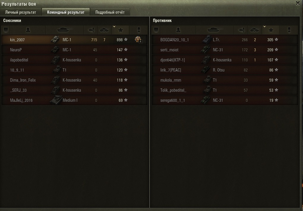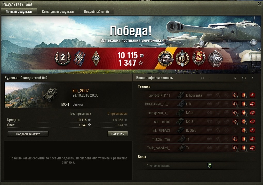 anonym_HpyRbD4eZW3H Опубликовано: 25 октября, 2016 Игроки 1 128 публикаций 22 923 боя Жалоба Поделиться Опубликовано: 25 октября, 2016 24 Окт 2016 - 15:36 пользователь kin_2007 сказал:Раньше согласился бы с "низачетом", но сейчас просто нет карт, где 1к урона можно нанести, крайне сложно, и то только в Рудниках с 2 лвл. Нет, не надоело (это к вопросу относится).Вот тут тоже не срослось набить 1к дамага, возможно смог бы, будь народу побольше.http://wotreplays.ru/site/9099678#stats Колобанов - это зачет. Ссылка на комментарий Поделиться на других сайтах Другие способы поделиться...