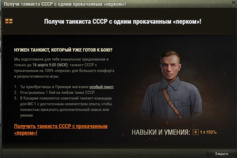 grig54 Опубликовано: 25 февраля, 2017 Игроки 6 228 публикаций 49 354 боя Жалоба Поделиться Опубликовано: 25 февраля, 2017 24 Фев 2017 - 21:16 пользователь sopulga сказал:Получил индивидуальное супер-пупер-мега-спец-предложение в преммагазине.Командир на МС-1 с 1 (одним Карл!) перком всего-то за 6 сотен рублей.Я вАсхищаюсь крутостью отдела маркетинга. Первый перк это наверно Снайпер или ББу? −−−• − −−− −• •− −−−− •− •••− •• −−•• −• −••− ••−−•• •• −−• •−• •− Фортуна любит смелых, а ВБР красных. ВЕРНИТЕ ПРОВИНЦИЮ-положите туда откуда взяли!!! Враг хитер и коварен. Огонь Провел на курортах Банландии 190 дней Ссылка на комментарий Поделиться на других сайтах Другие способы поделиться...