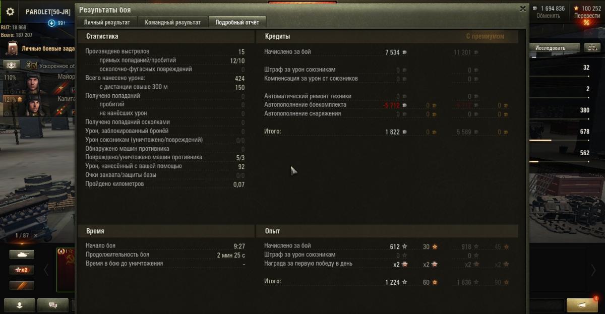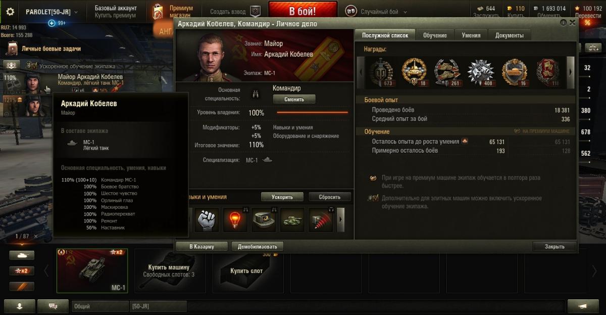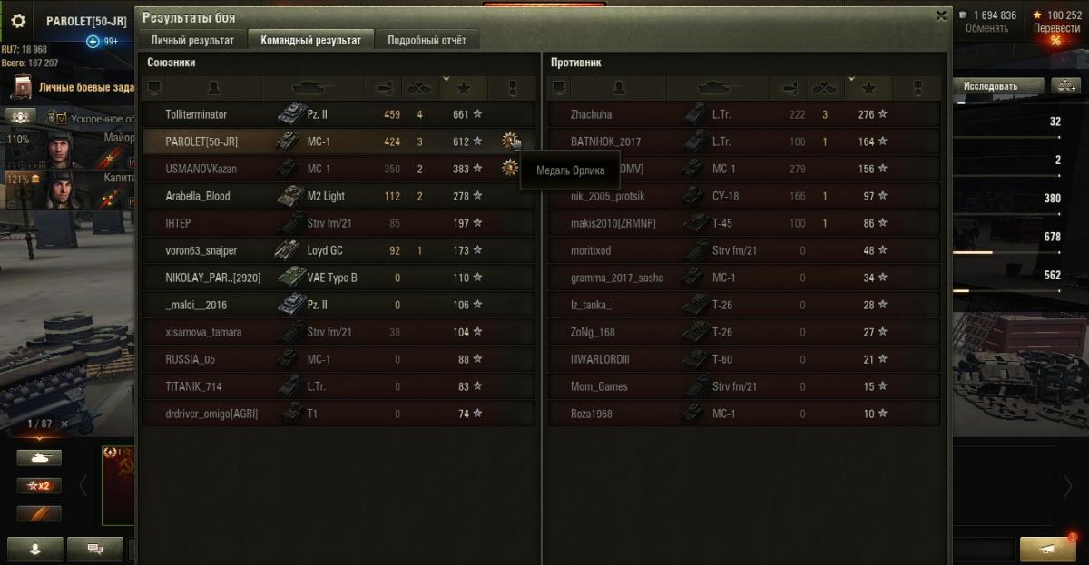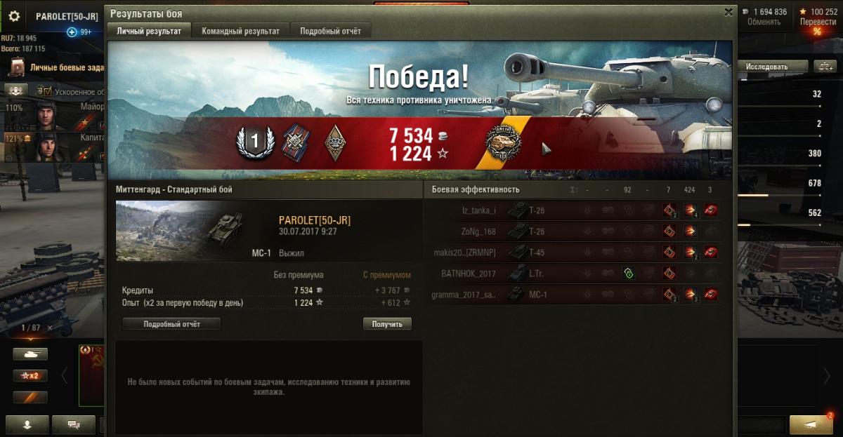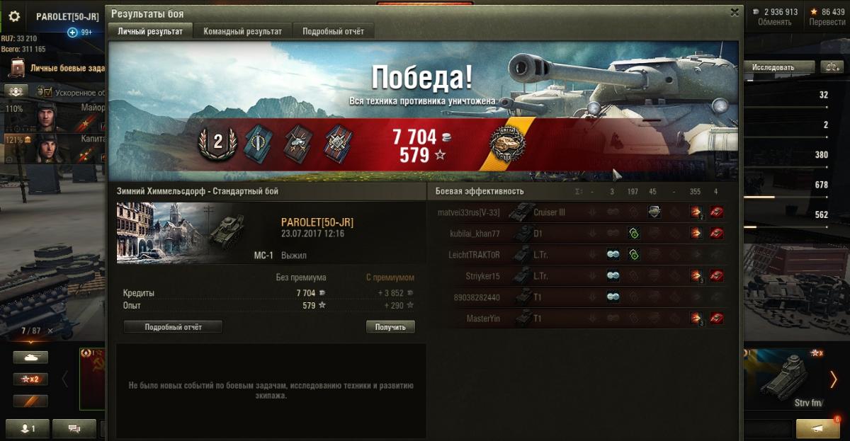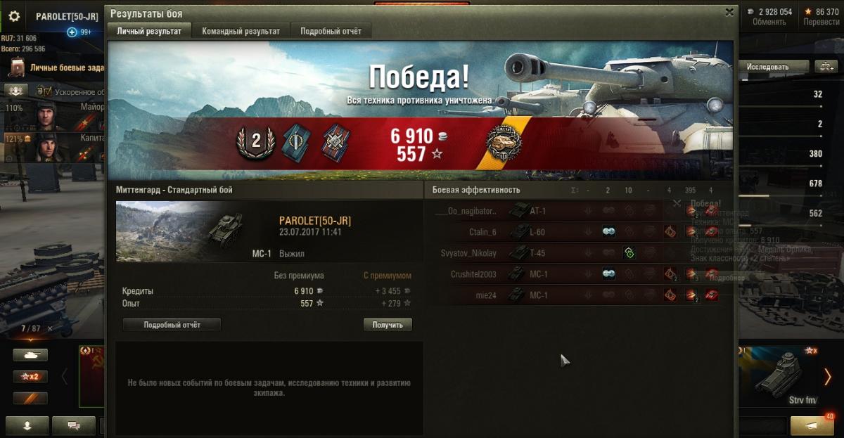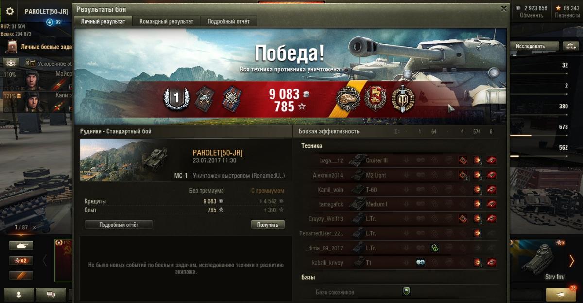 PAROLET Опубликовано: 30 июля, 2017 Игроки 8 400 публикаций 207 907 боёв Жалоба Поделиться Опубликовано: 30 июля, 2017 (изменено) 29 Июл 2017 - 22:26 пользователь Ewig_EiNSaMeR сказал:Доброй ночи!Есть вопрос к опытным "МоСеводам".Я в игре новичок, решил покачать советские тяжи. Начну, естественно, с танка 1 уровня, намереваюсь откатать на нем достаточно много боев - поучиться играть, изучить карты. Накопилось очень много вопросов по танку и не только:1. Какой геймплей рекомендуете? Как вести себя в базовых ситуациях?2. Модули и расходники. Что ставить, учитывая геймплей, который порекомендуете?3. Экипаж. Какие парки качать? Как его потом надо будет правильно пересадить на следующий танк? 1. Не лезть на рожон. Стиль - "стреляющий куст".Светим-отстреливаем-тащим...http://cdn-frm-eu.wargaming.net/wot/ru/uploads/monthly_07_2017/post-4921943-0-46155700-1501394006_thumb.jpghttp://cdn-frm-eu.wargaming.net/wot/ru/uploads/monthly_07_2017/post-4921943-0-37676900-1501394015_thumb.jpg2. По мере накопления серебра ставим то, на что его хватает. Окончательный набор может быть разным. вариант 1: - вентиляция, масксеть, стереотруба. вариант 2: - усиленные приводы, маскесть, стереотруба. возможны и другие сборки.Расходники так же имеют несколько вариантов из: - масло, регулятор, большой ремкомплект, большая аптечка, малый ремкомплект, малая аптечка.У меня стоит регулятор, малая аптечка и малый ремкомплект.Огнетушитель не возим совсем - танк не горит.3. Доп. умения качают в разной последовательности но одни и те же.Вот мой набор умений.http://cdn-frm-eu.wargaming.net/wot/ru/uploads/monthly_07_2017/post-4921943-0-99739900-1501393990_thumb.jpghttp://cdn-frm-eu.wargaming.net/wot/ru/uploads/monthly_07_2017/post-4921943-0-99914800-1501393999_thumb.jpg___________________________________________________________________При такой игре результат стабилен даже против 2 ЛВЛа.http://cdn-frm-eu.wargaming.net/wot/ru/uploads/monthly_07_2017/post-4921943-0-33867700-1501394022_thumb.jpghttp://cdn-frm-eu.wargaming.net/wot/ru/uploads/monthly_07_2017/post-4921943-0-91247200-1501394029_thumb.jpghttp://cdn-frm-eu.wargaming.net/wot/ru/uploads/monthly_07_2017/post-4921943-0-04392800-1501394037_thumb.jpg(последние бои). Изменено 30 июля, 2017 пользователем PAROLET Aut cum scuto, aut in scuto! Ссылка на комментарий Поделиться на других сайтах Другие способы поделиться...