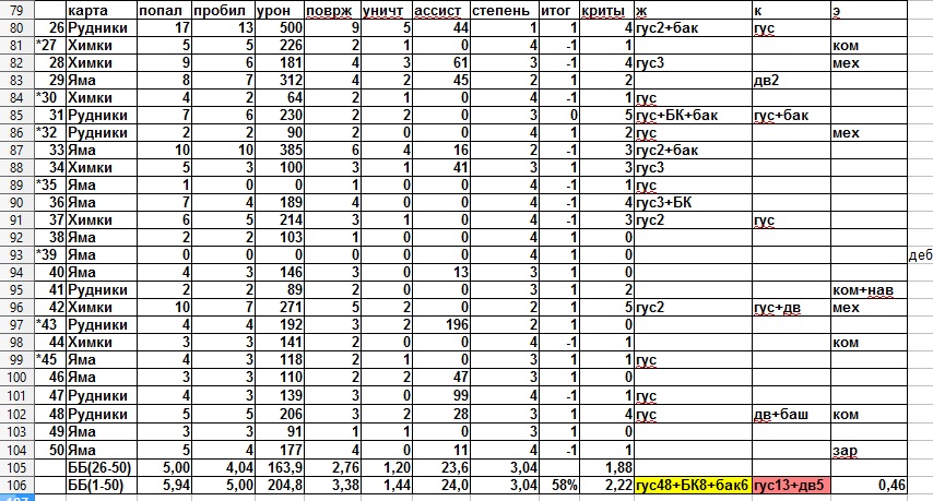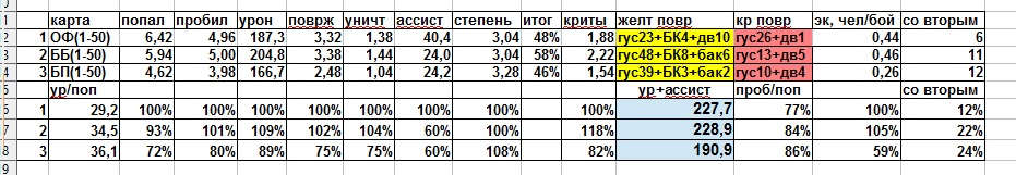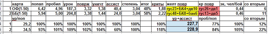 KPOT2338 Опубликовано: 6 декабря, 2017 Игроки 21 567 публикаций 38 512 боёв Жалоба Поделиться Опубликовано: 6 декабря, 2017 (изменено) Доиграл ББВы не поверитеСейчас доделаю, выложуЭто вторая половина на ББhttp://cdn-frm-eu.wargaming.net/wot/ru/uploads/monthly_12_2017/post-7033054-0-37358600-1512590102_thumb.jpgА вот это сравнениеhttp://cdn-frm-eu.wargaming.net/wot/ru/uploads/monthly_12_2017/post-7033054-0-16338300-1512590663_thumb.jpgСредний урон за попадание ОФ=29хп, ББ=34хпПроцент попаданий с уроном ОФ=77%, ББ=84%Средний урон ОФ=187, ББ=204Средний ассист ОФ=40, ББ=24А вот их сумма ОФ=227,7, ББ=228,9, т.е. абсолютно поровнут.е. на ББ я просто смог частично добрать то, что на ОФ отдавал другимС двойками ОФ=12%, ББ=22%И почему-то на ББ получилось ровно в 2 раза больше бесполезных жёлтых критов гусеницКритуемость экипажей одинакова - примерно 0,45 человека за бой з.ы. Вывод забыл.ББ не имеет решающего преимущества перед фугасами.По крайней мере против первых уровней.Количество боёв с которыми примерно 80-85% Изменено 6 декабря, 2017 пользователем KPOT2338 2 Что не делается, всё к лучшему! (с) Cos 700=0.3420, Cos 850=0.0872Кто нибудь привяжите его руки к подлокотникам, и клавиатуру у него заберите. И вообще любое устройство с которого можно печатать. (с) kojot7Введите уже артприцел для всей техники Ссылка на комментарий Поделиться на других сайтах Другие способы поделиться...