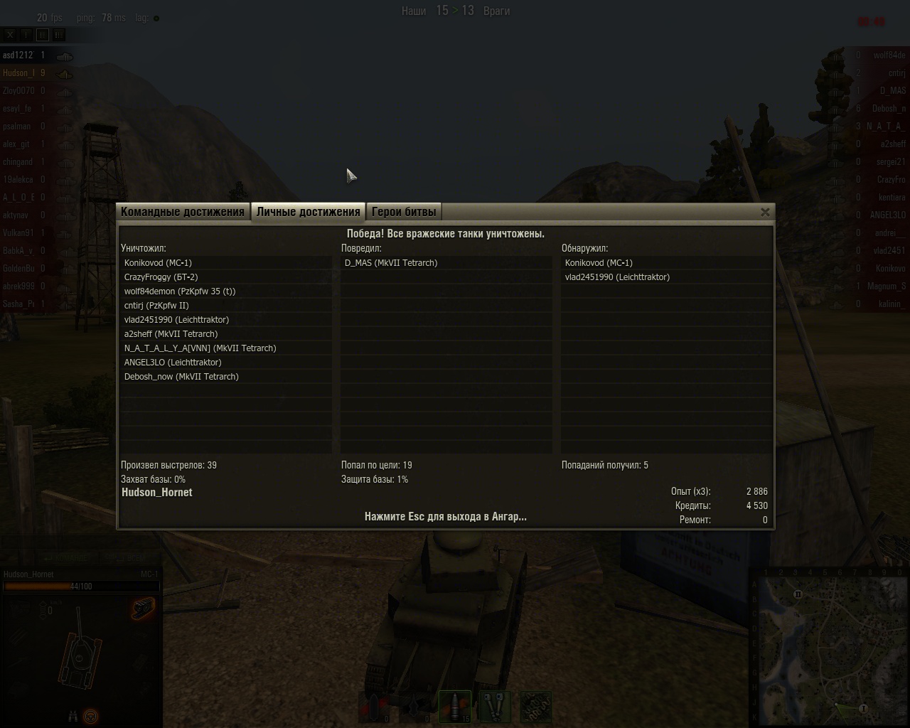 RenamedUser_3855685 Опубликовано: 24 марта, 2012 Игроки 343 публикации Поделиться Опубликовано: 24 марта, 2012 24 Мар 2012 - 00:34 пользователь rypraht сказал:у меня 13Победа!Бой: Рудники 24 марта 2012 г. 0:56:52Танк: МС-1Получено опыта: 1 506Получено кредитов: 10 107Достижения в бою: «Воин» (жаль за полтора часа до этого кочился прем)Spoilerhttp://rghost.ru/37188119/image.pngСалютую !!! :Smile_honoring: Но хотелось бы реплей Ссылка на комментарий Поделиться на других сайтах Другие способы поделиться...