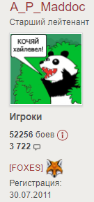 A_P_Maddoc Опубликовано: 3 декабря, 2019 Игроки 6 330 публикаций 86 522 боя Жалоба Поделиться Опубликовано: 3 декабря, 2019 http://cdn-frm-eu.wargaming.net/4.5/style_images/wg/snapback.pngCaM6O_IIaHgA (03 дек 2019 - 21:23) писал:Маддося, сначала Мастер, после всё остальное.Пандочко, я бы мог поставить в твоём нике апостроф и/или пробел, но до твоего уровня опускаться не буду.Так, на всякий случай, вдруг ты не в курсе:http://cdn-frm-eu.wargaming.net/wot/ru/uploads/monthly_11_2019/post-2795065-0-93266400-1574165859_thumb.pnghttp://cdn-frm-eu.wargaming.net/4.5/style_images/wg/snapback.pngCaM6O_IIaHgA (03 дек 2019 - 21:23) писал:Только во вселенной Маддоськи аутсайдеры дают шансы победителям!)))Только во вселенной Пандочек слившиеся считаются победителями, а остальные - аутсайдерами.Так что там с покатушками? Пока я добрый - можешь претендовать на моё внимание. Или слиться решил и вот это вот всё:http://cdn-frm-eu.wargaming.net/4.5/style_images/wg/snapback.pngCaM6O_IIaHgA (08 ноя 2019 - 09:16) писал:сыграть со мной нормальные покатушки, по тому самому регламенту на который он ссылался со своей табличкой. 20х20 песок/хай-лвлбыл пустой трёп в твоём обычном стиле? +++[>+++>+++>+++>+++>+++<-]>+++>>+++.---.<+++.+++.<.>----.<.>++.<++.---.<<<.>>>---.+++.>-.+.<<<+. 11 Сен 2018 - 23:51 пользователь CaM6O_IIaHgA сказал: Ответь для начала на вопрос, ты видишь разницу между понятиями "механика нанесения урона" и "механика снятия хп"? Ссылка на комментарий Поделиться на других сайтах Другие способы поделиться...
