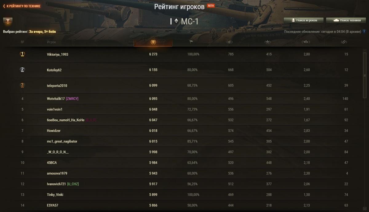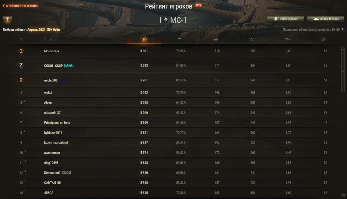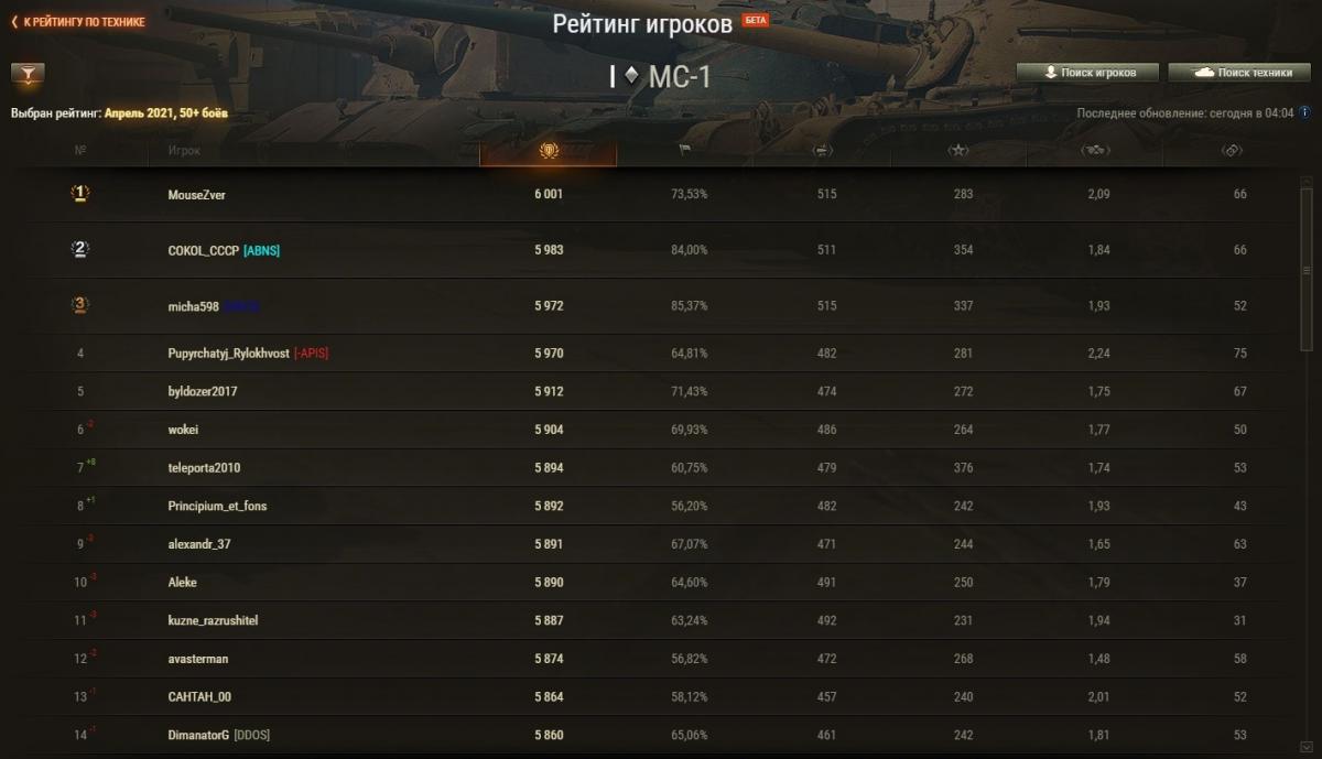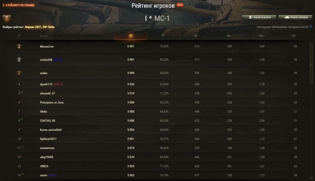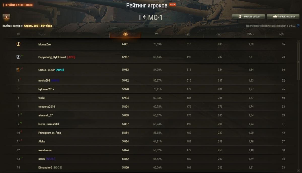 Zongi Опубликовано: 29 апреля, 2021 Игроки 2 234 публикации 19 375 боёв Жалоба Поделиться Опубликовано: 29 апреля, 2021 Рейтинги по итогам 28 апреля: http://cdn-frm-eu.wargaming.net/wot/ru/uploads/monthly_04_2021/post-6633688-0-43274000-1619696575_thumb.jpg http://cdn-frm-eu.wargaming.net/wot/ru/uploads/monthly_04_2021/post-6633688-0-14774500-1619696584_thumb.jpg http://cdn-frm-eu.wargaming.net/wot/ru/uploads/monthly_04_2021/post-6633688-0-14419400-1619696591_thumb.jpg 3 С утра орава модераторов модерировала-модерировала, да и не вымодерировала, не вымодерировала ) Ссылка на комментарий Поделиться на других сайтах Другие способы поделиться...