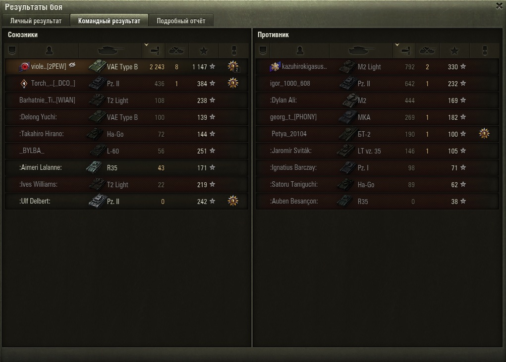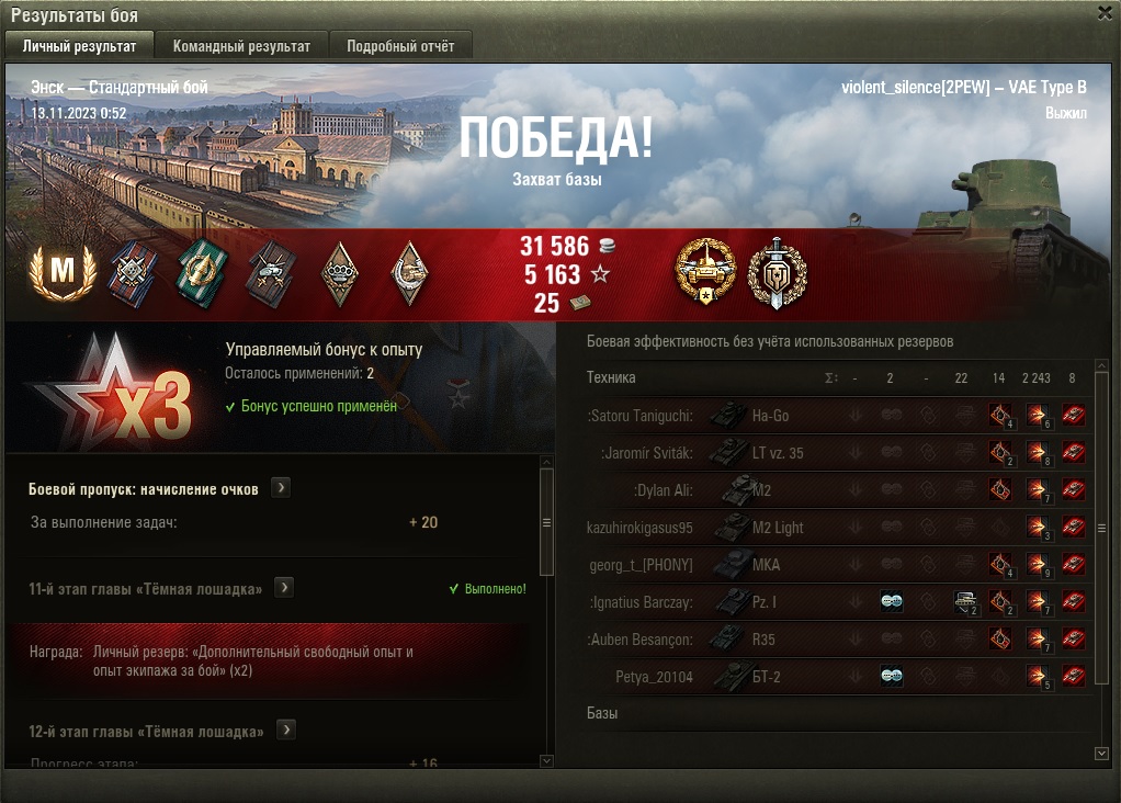 IlIlIlIlIllll Опубликовано: 13 ноября, 2023 Игроки 6 288 публикаций 37 791 бой Жалоба Поделиться Опубликовано: 13 ноября, 2023 13 ноя 2023 - 13:21 пользователь violent_silence сказал: Вы все про какого-то забагованного "мастера" вещаете (в прошедшем времени), но, имхо, баги есть до сих пор. Вчера сыграл потнючий бой против 4-х живых игроков, с рекордным уроном по вторым уровням. И за сий лютый нагиб () дали жалкие 1150 опыта. Вместе с тем, буквально 3 месяца назад (не так давно), играя на Минимаусе я просто как в тире перестрелял ботусиков, получив аж 1750 (!!!) опыта. 1750, Карл! При меньшем уроне, меньшем числе фрагов, меньшем числе врагов на уровень ниже... Это рофл или как? А вы про какие-то 1000 опыта спорите... Ты наверное сам планку на мастера поднял, напиши кстати когда закончишь VAE катать, а то я никогда мастера на нем не возьму Статистика ББ2021 Ссылка на комментарий Поделиться на других сайтах Другие способы поделиться...